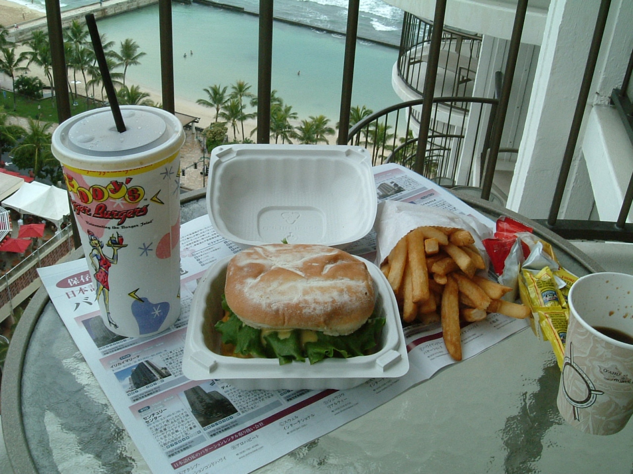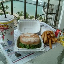 マリオットホテルに宿泊していたのでカピオラニ公園側に数分歩いて行けました。部屋のテラスで食べようとテイクアウトにしてもらいました。名前は忘れたのですがオーソドックスな私にも食べきれそうな大きさのバーガーにしました。ポテトもバーガーもとても美味しかった。混んではいなかったのですが待ち時間がかなりありました。