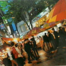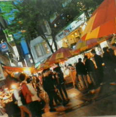 狭いショッピング街に、ホット、チヂミやギョーザなどの屋台がずら~り!