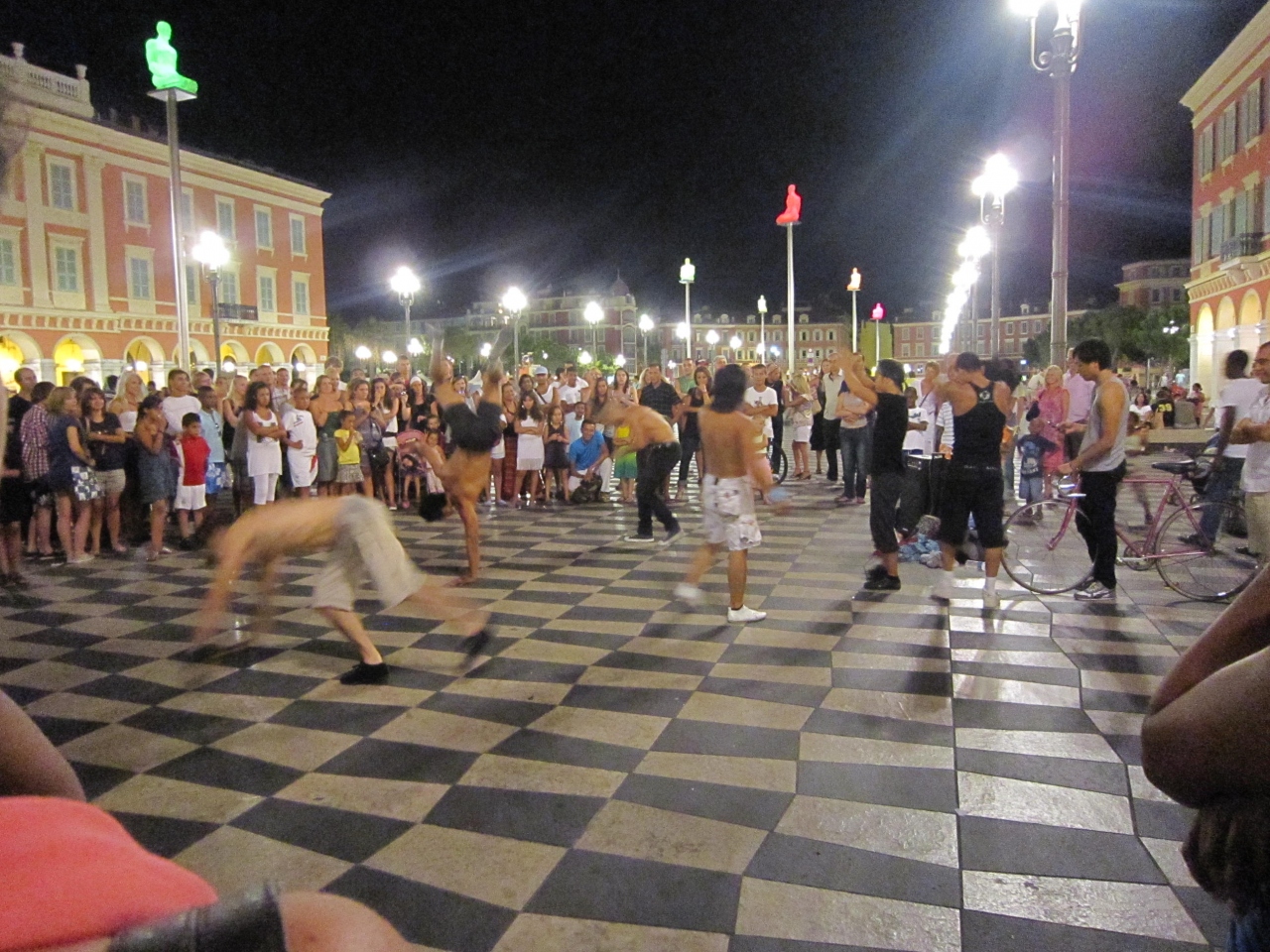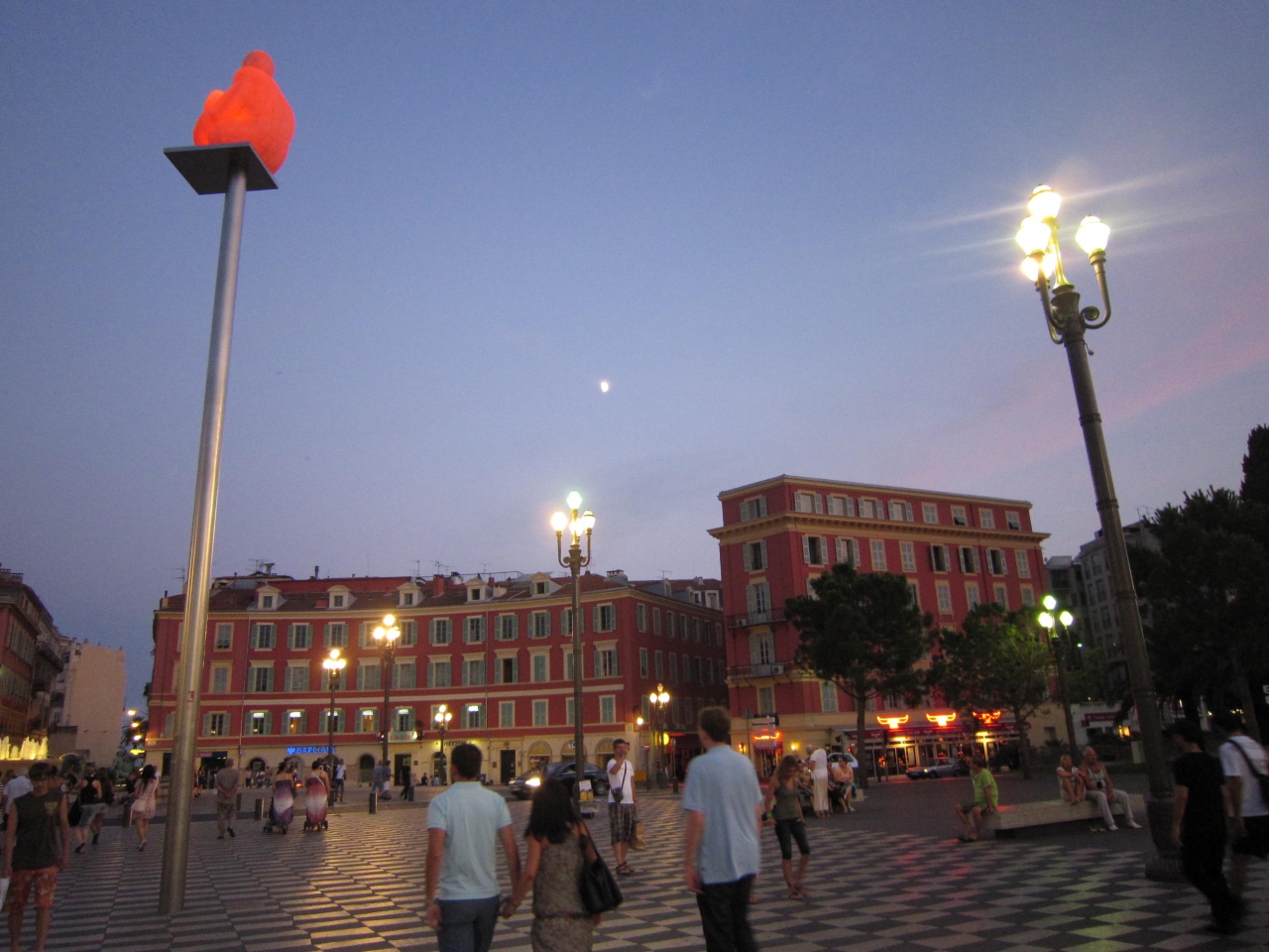 ニースの中心にある賑やかな広場で、真ん中を路面電車が通ります。近年改修されたばかりだという広場と取り囲む建物は鮮やかなレンガ色に統一されていて、まるで映画のセットのように整然としています。路上の片隅では昼も夜もダンスや音楽演奏などのパフォーマンスをしていて道行く人を楽しませています。夜になると、色鮮やかな街灯が広場をと道行く人々を照らして綺麗です。