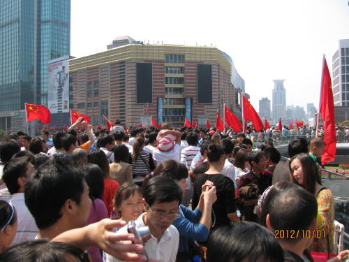 旧正月の春節と五月の国際労働節と並ぶ法廷祝日連休です。国慶節とは中華人民共和国の建国記念日。1949年10月1日に故・毛沢東主席が天安門で建国宣言をした日で7日間のお休みとなる。休暇を利用して故郷に帰る人、国内、海外旅行に行く人など楽しみにしている人が多い。日本に旅行を計画していた人も多くいましたが香港、韓国、ハワイなど他の国に変更したようです。日本人も他の国に変えたようです。浦東一の繁華街、陸家嘴の国慶節はどんなものでしょうか?地下鉄陸家嘴駅に降りると初詣状態。駅を出るだけでも大変です。正大広場前の歩道橋が壊れるのではと思うほどの人・人・人です。ここは歩道橋を通らないと正大広場へもテレビ塔へも行けません。また歩道橋の上から見る景色が素晴らしいので写真を撮る人、物売りがいて人の流れも悪い。正大広場の日本食の店も混んでいます。あまり影響は無いようです。ただ日本人観光客は見えませんでした。