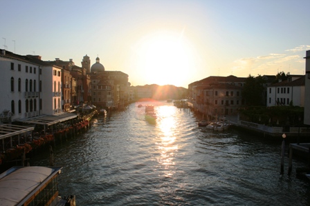 水の都ベネチアの入り口にある橋がスカルツィ橋から撮影した、ベネチアの大運河に昇る朝日。水の都ベネチアは自動車が入らず、現代社会においては世界で唯一無二の本当にきれいな、世界で最も美しい都という言葉が本当に当てはまる街です。