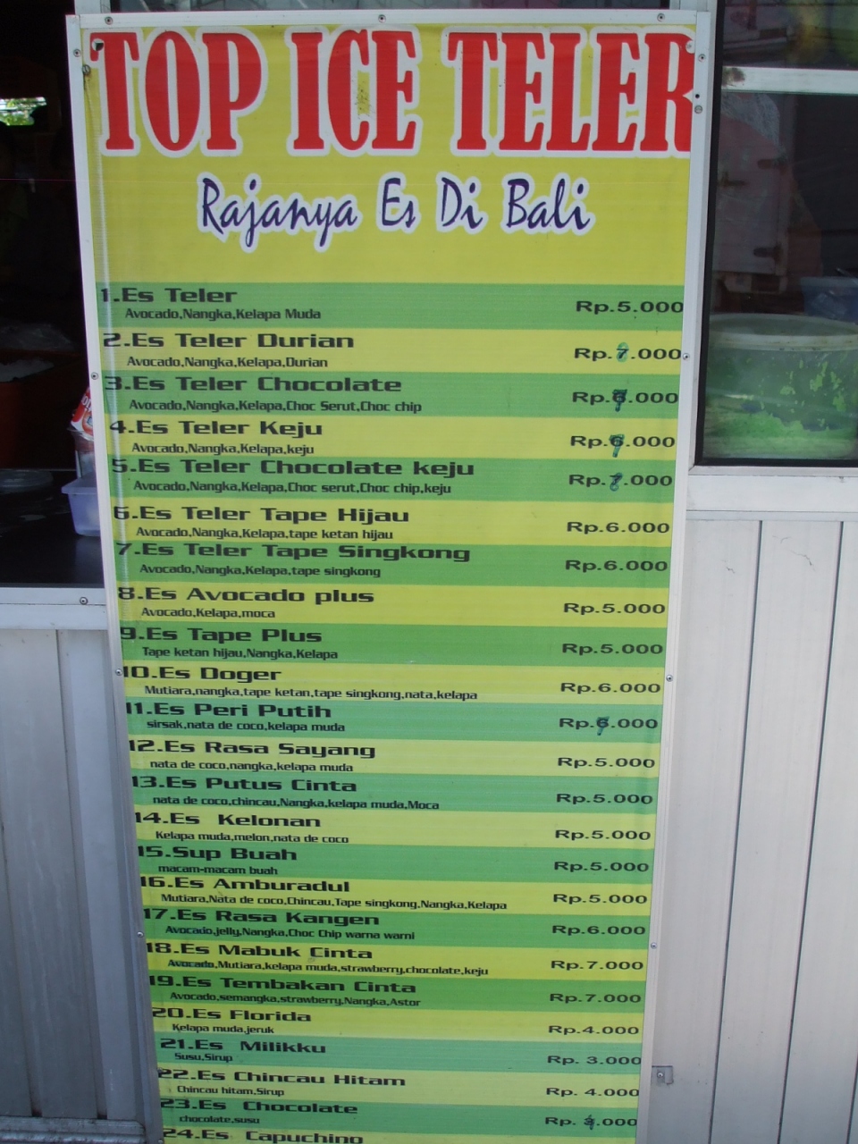 様々なバリかき氷とフレッシュ・フル−ツ・ジュースの専門店。マンゴ−・ジュ−ス一つとっても他店とは比べようがないくらい大変、美味!!かつ安いので、店は地元の若い女性客で大繁盛。