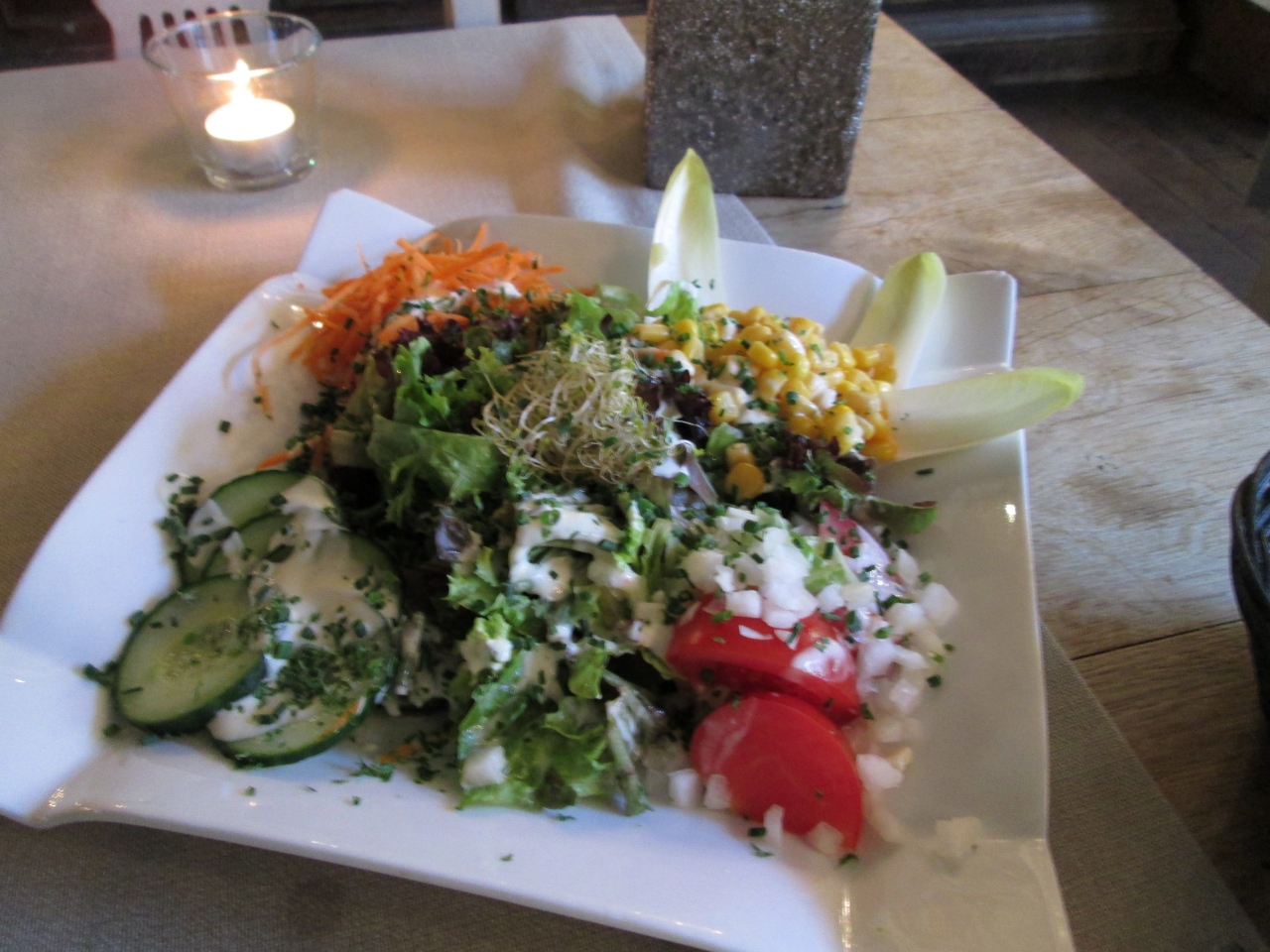 ビールとムール貝と野菜サラダを注文しましたがムール貝は鍋一杯ありサラダも20センチはゆうにある皿に盛ってありました。サラダだけで4人分あったと思われる。料金は総額で3,000円位でした。