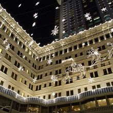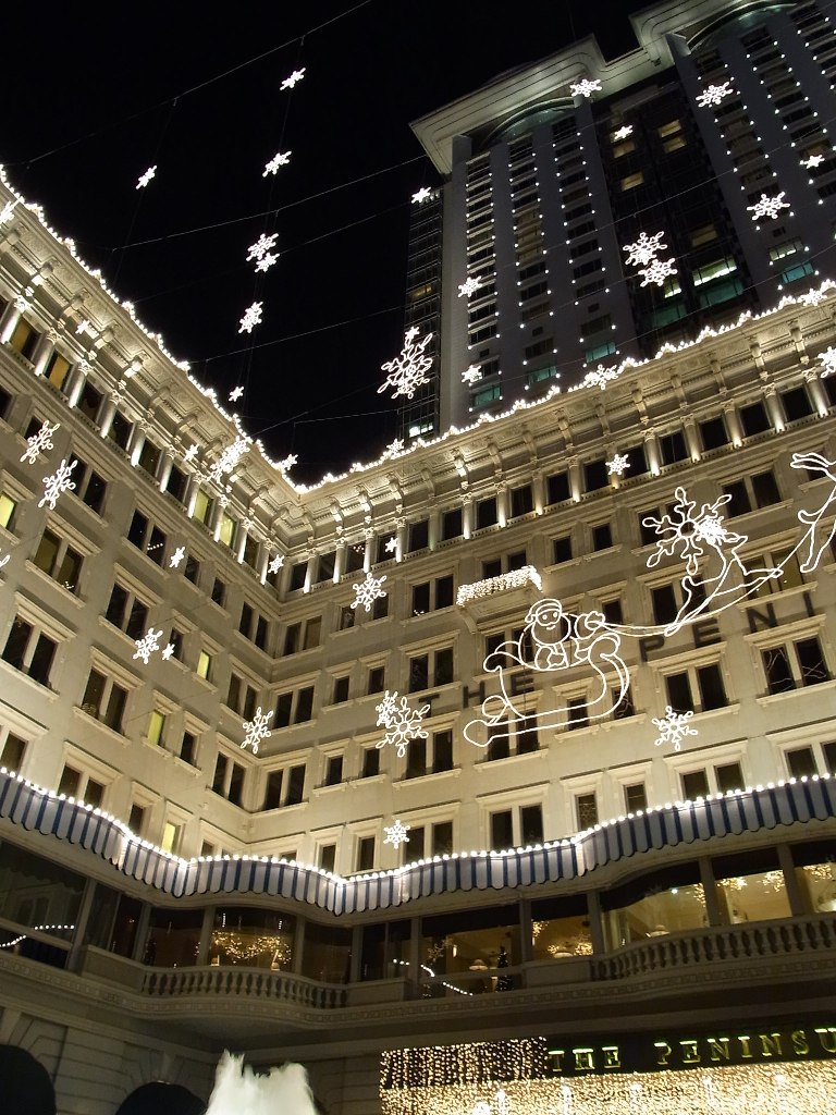 12月は、どこを歩いてもクリスマス!とても楽しくなりますが、ペニンシュラホテルの前には、雪の結晶のオブジェがたくさんぶらさがっていて、大人っぽく、素敵でした。夜になると周りが暗いので、白い結晶のオブジェが浮かんでいるように見えました。