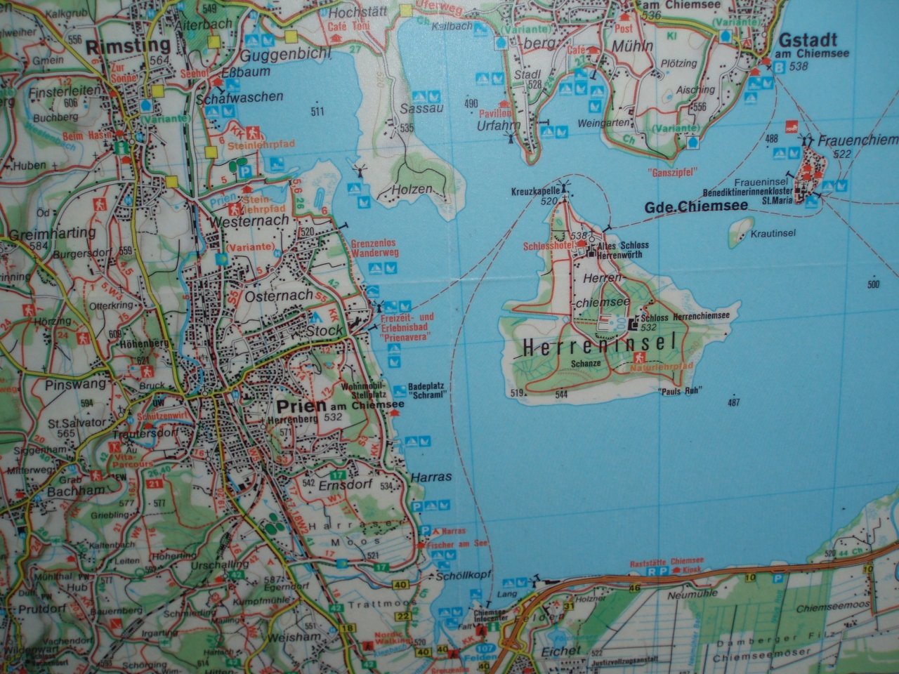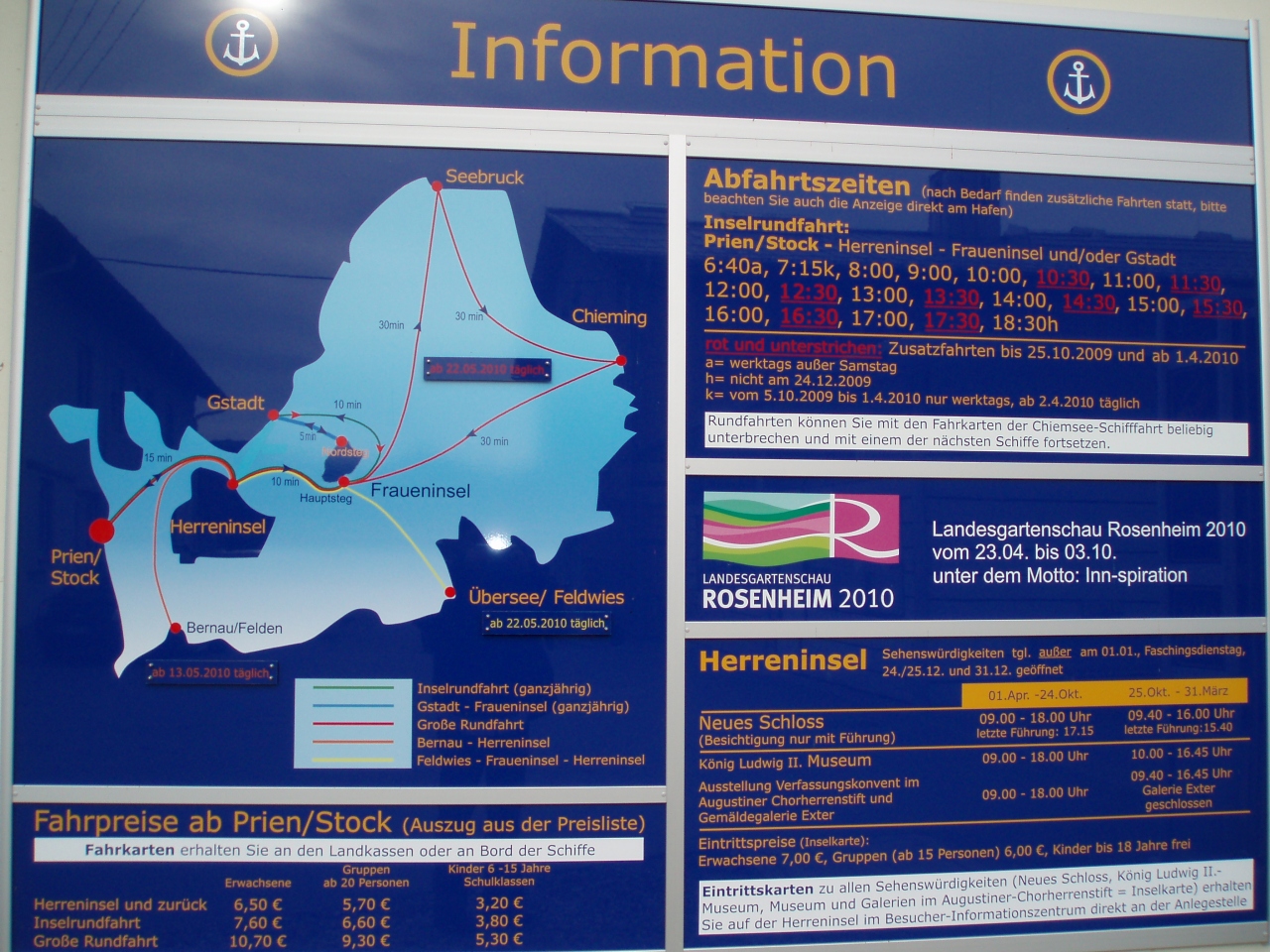 ミュンヘン中央駅よりドイツ国鉄RE/RB快速で1時間10分、最寄りの駅はプリーンPrien、片道運賃15.20ユーロもするので、一日乗車券Bayern-Ticket single 20.00ユーロを購入した方がお得です。