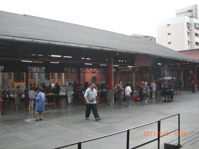 周りで台湾人が赤い小さな月型の木の札を地面に投げて占いをやっていました。