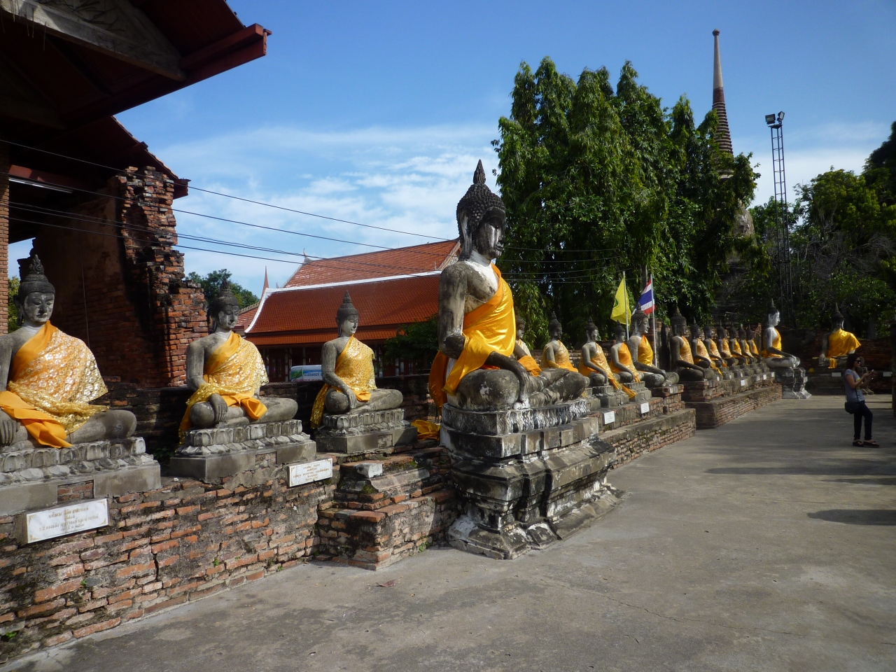 境内の中央の仏塔は高さ72mもあるそうで古代ビルマ軍との戦いに勝利した記念に建てられたそうです。実際に登ると結構な高さがあります。その周辺には黄色の袈裟をまとった座仏がずらりと並んでおり圧巻です。