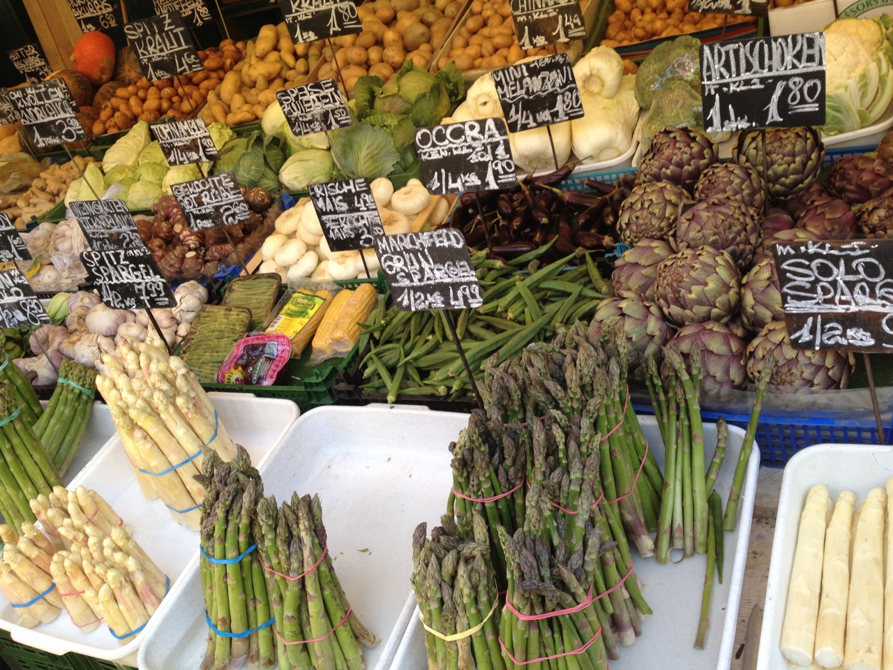 シーフード、ナッツ類などありましたが、八百屋さんにはホワイトアスパラが陳列されていて、この季節ならではの春の光景ではないでしょうか。