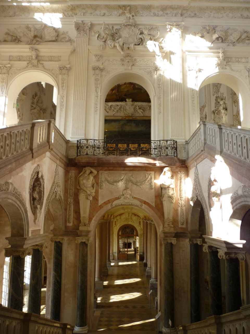 旧シュライスハイム城の内部は博物館になっていますが、新シュライスハイム城の内部はお城のままで、豪華なお城の作りやお部屋を見学することができます。見学客は他に1組いただけだったので、ほぼ貸切状態で雰囲気を楽しめ、吹き抜けになっている階段を登るときなどは、素敵な気分が味わえました。