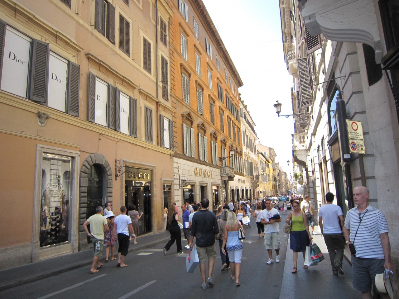 スペイン広場からのびるブランド通りで、プラダ、フェラガモ、グッチ、アルマーニなど有名店が並んでいます。場所柄、広場からの流れでブラブラ歩いている観光客も多いので気兼ねなくウィンドショッピングできます。通りにクロスする小路沿いには比較的庶民的な店があります。