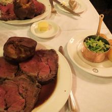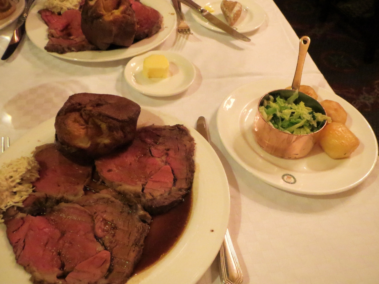 一品目はスープを選択、さつまいもやきのこの風味がたっぷりの、秋らしいスープでした。しかし容器がこっぽりしており量が多い(笑)続いてメインのローストビーフ。トロリーが運ばれて来て、目の前で切り分けてくれます。鮮やかな手つきでお肉三切れ+ヨークシャープディングが盛り付けられ、グレービーをたっぷり。またホースラディッシュ(西洋わさび)もつけてもらえます。スタッフの方の申し出で、サーブされたお肉と一緒に写真撮影していただけました。その後さらに付け合せのポテトとキャベツがやって来て、おかずばかりとはいえすごい量に。。でもお肉は美味しくて、かつ赤身で食べやすく、ホースラディッシュと一緒にいただくとさっぱりしていてどんどんいけます。脂身の苦手な方は事前にそう伝えるとより赤身ばかりサーブしてもらえると思います。ヨークシャープディングはまさにシュークリームの皮なのですが、これをグレービーと共にいただくと美味しくてペロリでした。ポテトだけ完食できずに残してしまったのですが・・・。ゆっくりと優雅な気分で食事を進め、最後の方は相当満腹に。デザートメニューにもそそられるものがあったのですが、さすがに諦めました。大きな胃袋が欲しい。