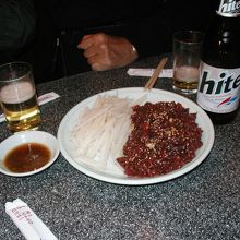 東大門市場の近くにある広蔵市場のユッケ専門店。この広蔵市場はソウルの市場の中でもかなりディープなところで、あまり日本人は見かけません。その一角にユッケ専門店が5、6店軒を並べています。写真のユッケで千円ぐらいですよ。