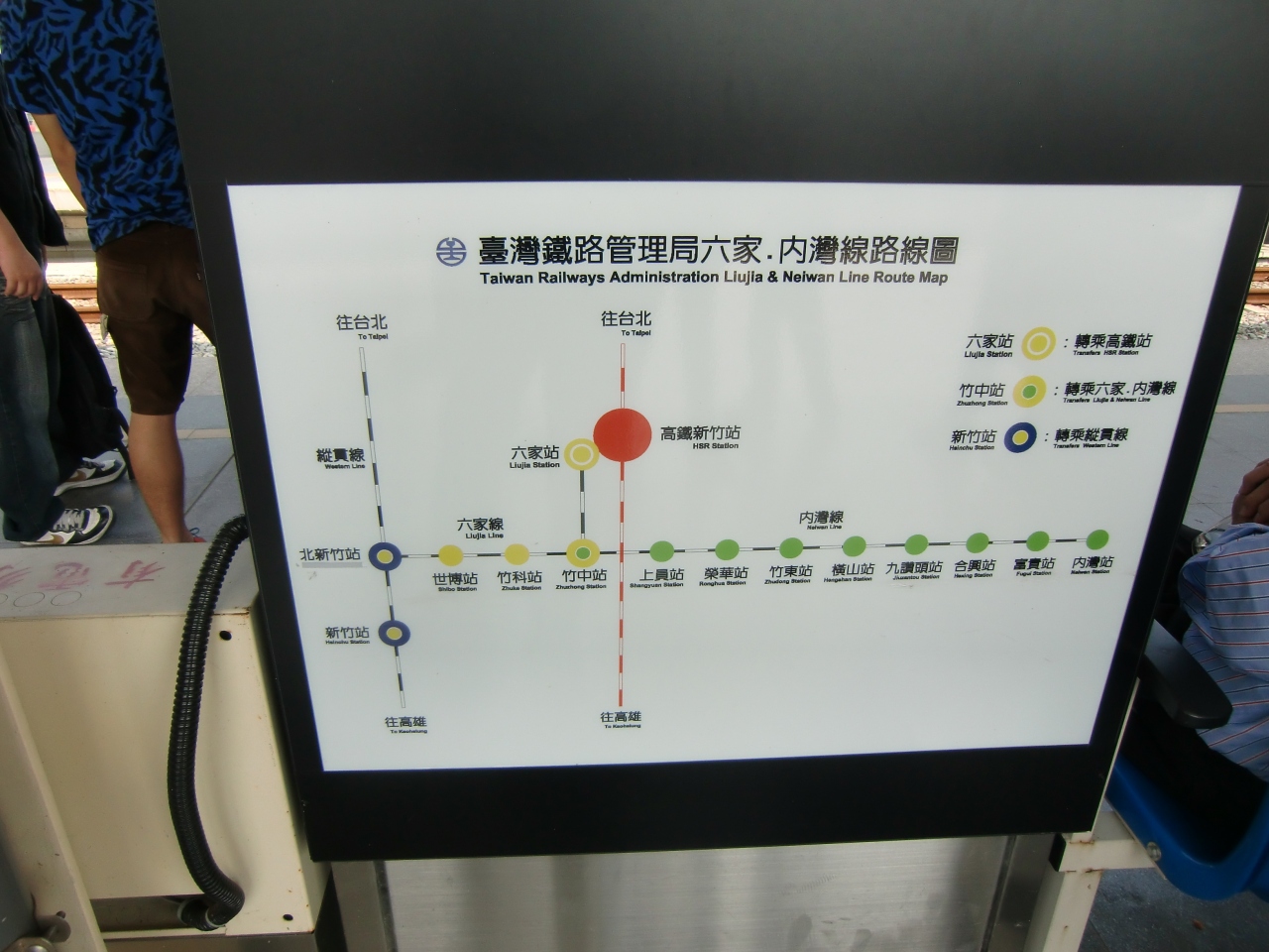 台鐵新竹駅から内湾駅に向かう場合、六家駅行きに乗り、途中の竹中駅での乗り換えが必要です。台鐵のホームページで時刻を調べることができますが、この場合も竹中駅から内湾駅で調べないと、表示されるの朝夕に数本ある台鐵新竹駅から内湾駅行きの直通だけです。