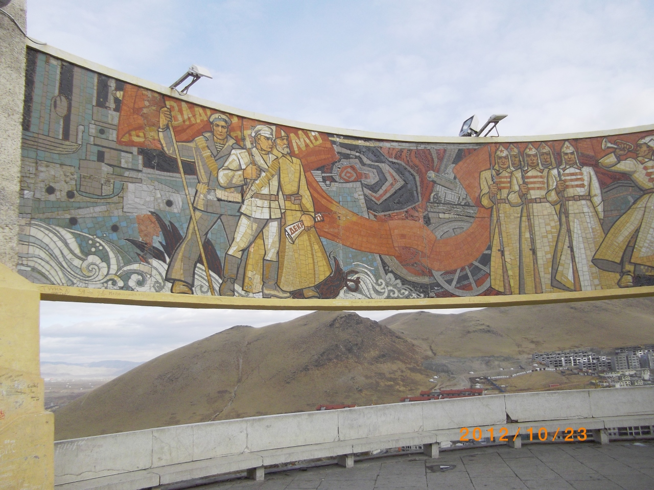 駐車場で車をおりて階段を少し上がります。丘なので風が強いです。ウランバートルの街を一望できます。
