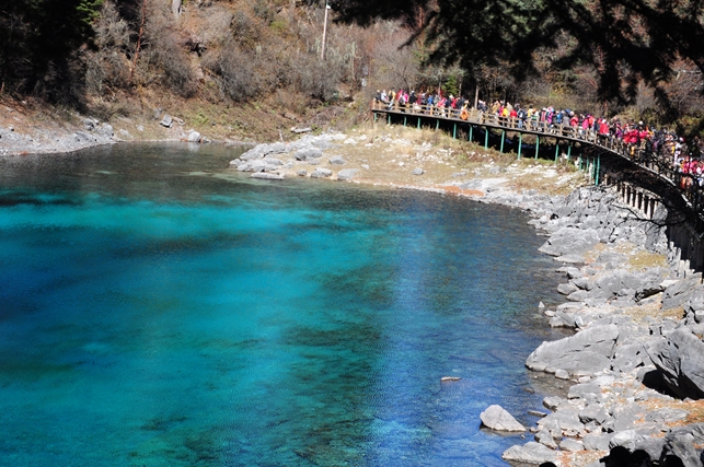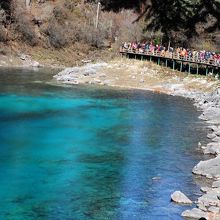 五彩池というくらいですので、様々な色に見えるということで有名な池です。ものすごくたくさんのブルー、グリーンがあって、とても美しいです。とりあえず九寨溝景区のなかで、ここだけは特に外せないと思います。滞在中、2,3回行きましたが、いずれも時間帯や天気で色合いが違いました。時間があれば何度か行ってみることをお勧めします。