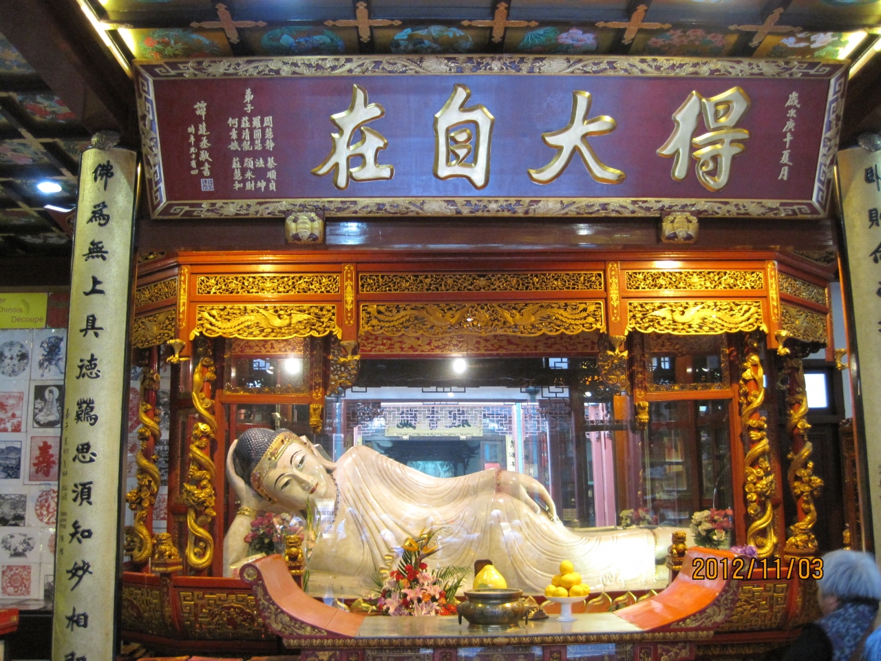お寺の門をくぐると結構奥行きがあり、仏様など順番に見ながら奥に進んで下さい。全体的には商業的な部分があります。奥に入って行くとヒスイの寝仏(この寺の名前の由来)があります。しかし、これは本物ではなく、本物は2階にあります。普通に見て回ると本物を見逃す可能性があります。本物は1階の仏様より小さめです。ヒスイで綺麗に細工された仏様です。また、ここでは昼食が食べられ、美味しいらしいです。私は残念ながら食事した後で行ったので食べれませんでしたが。