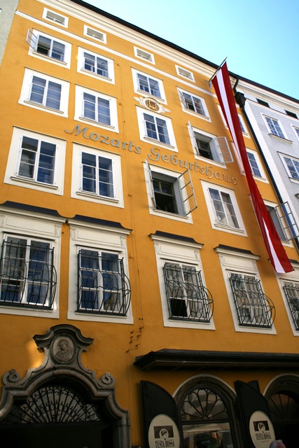 ゲトライデガッセの中ほど、一際目立つ黄色い建物がモーツァルトゲブーツハウス(生家)。中は記念館になっておりモーツァルトが使った楽器や自筆の楽譜、手紙などが展示されている。ヨーロッパ各国の観光客が来ており、モーツァルトの人気の高さがうかがえます。