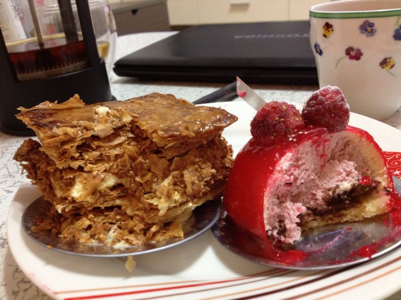 写真の白いケーキは白い部分は生クリーム、中にはバナナとアプリコットジャムのような酸味のあるジャムが入っています。ミルフィーユのパイ生地はさくさくだし、イチゴのムースも中にチョコレート味のスポンジがプラスされているなど工夫がなされていて飽きません。