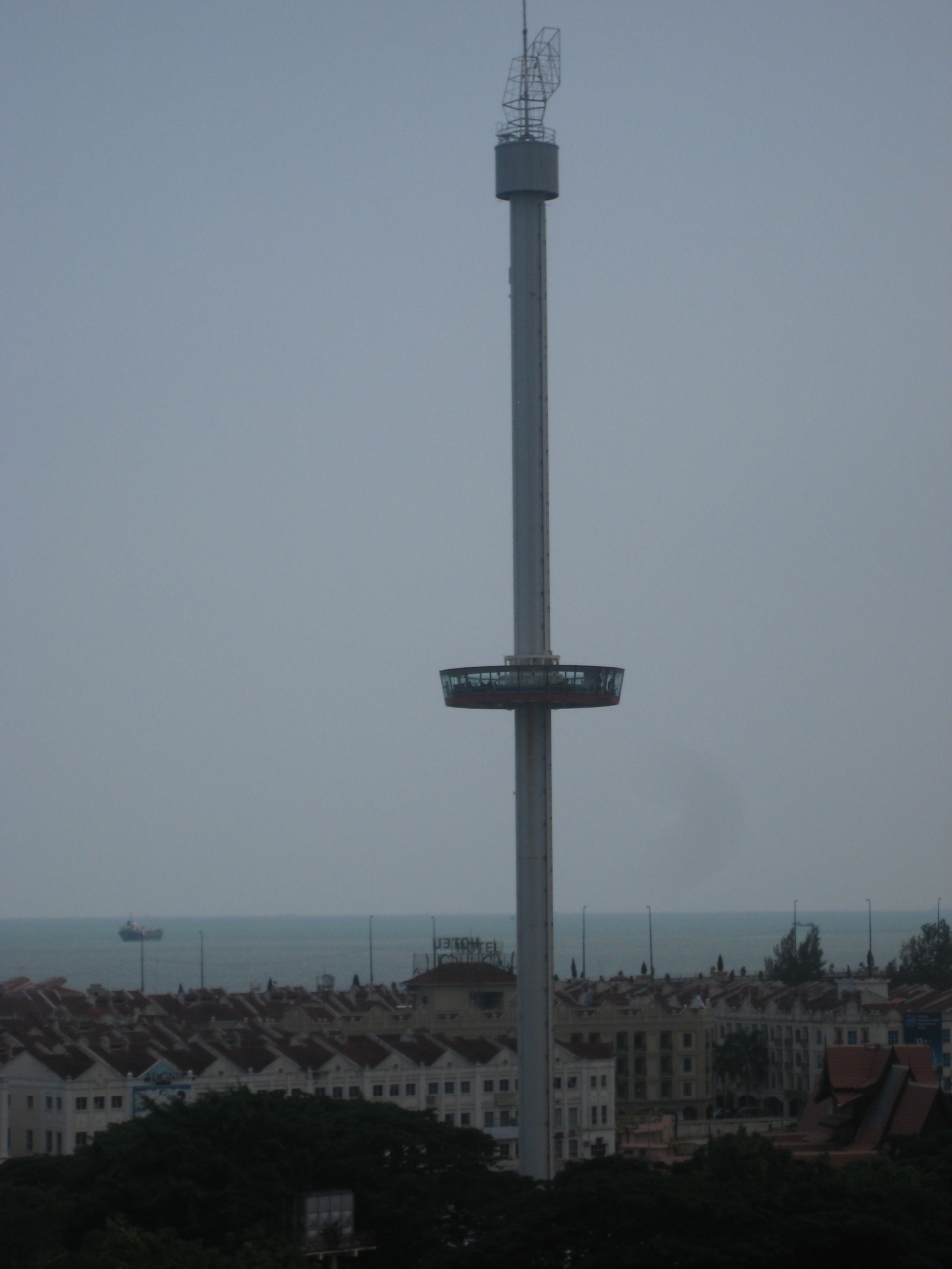 マラッカは、マレーシアで最も古い歴史を持ち、街全体が世界遺産として登録されています。ここマラッカの市内で一番高いタワーがあります。このタワーは、80人乗りの冷暖房付きのキャビンで、回転しながら、高さ110メートルまで上ります。往復で約15分の空の旅、のんびり回転をするので、動いている感じはあまりしませんが、少しずつ見える景色が変わっていきます。マラッカ市内の街並みはもちろんのこと、マラッカ海峡まで一望できます。