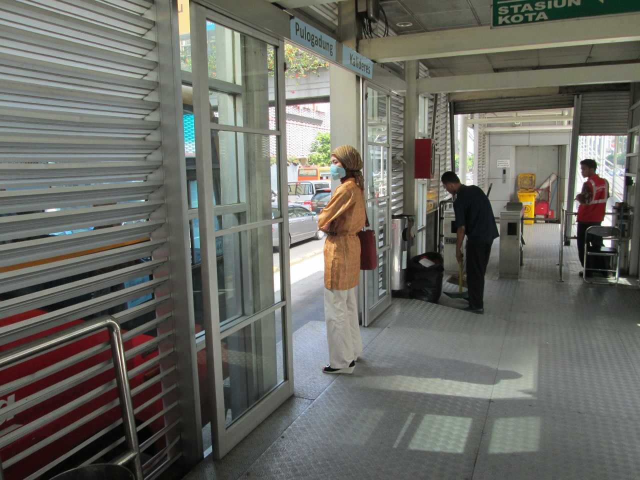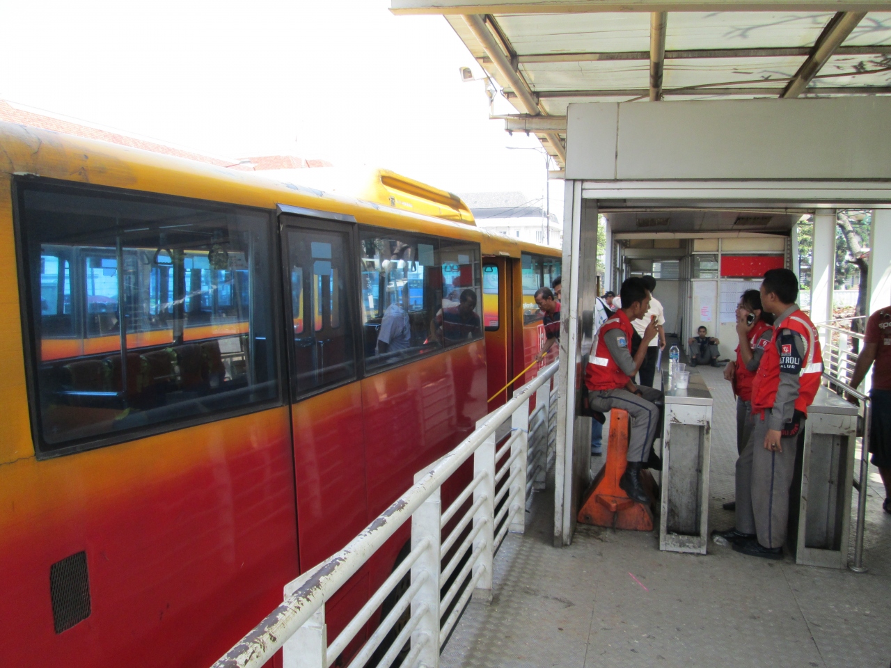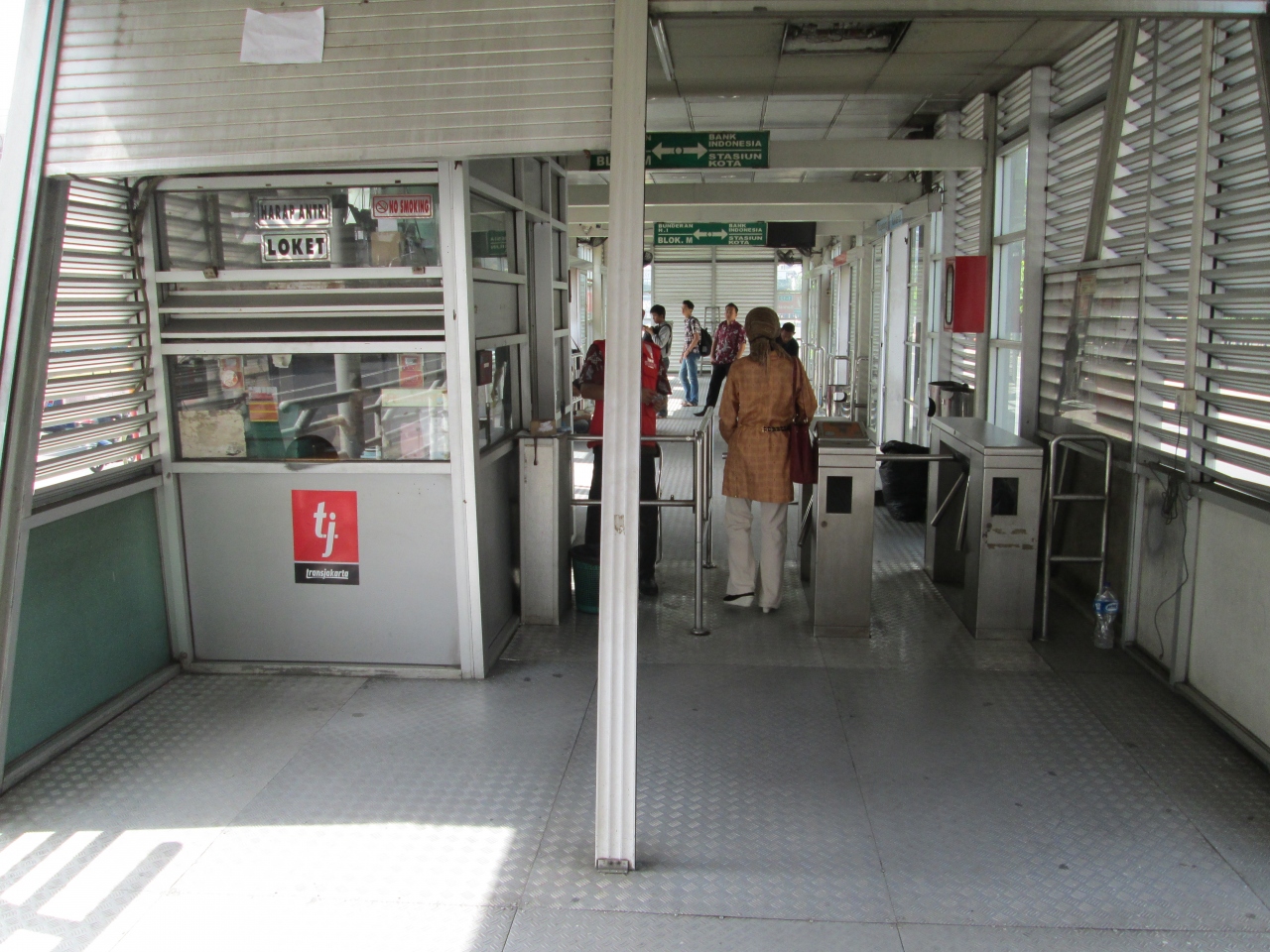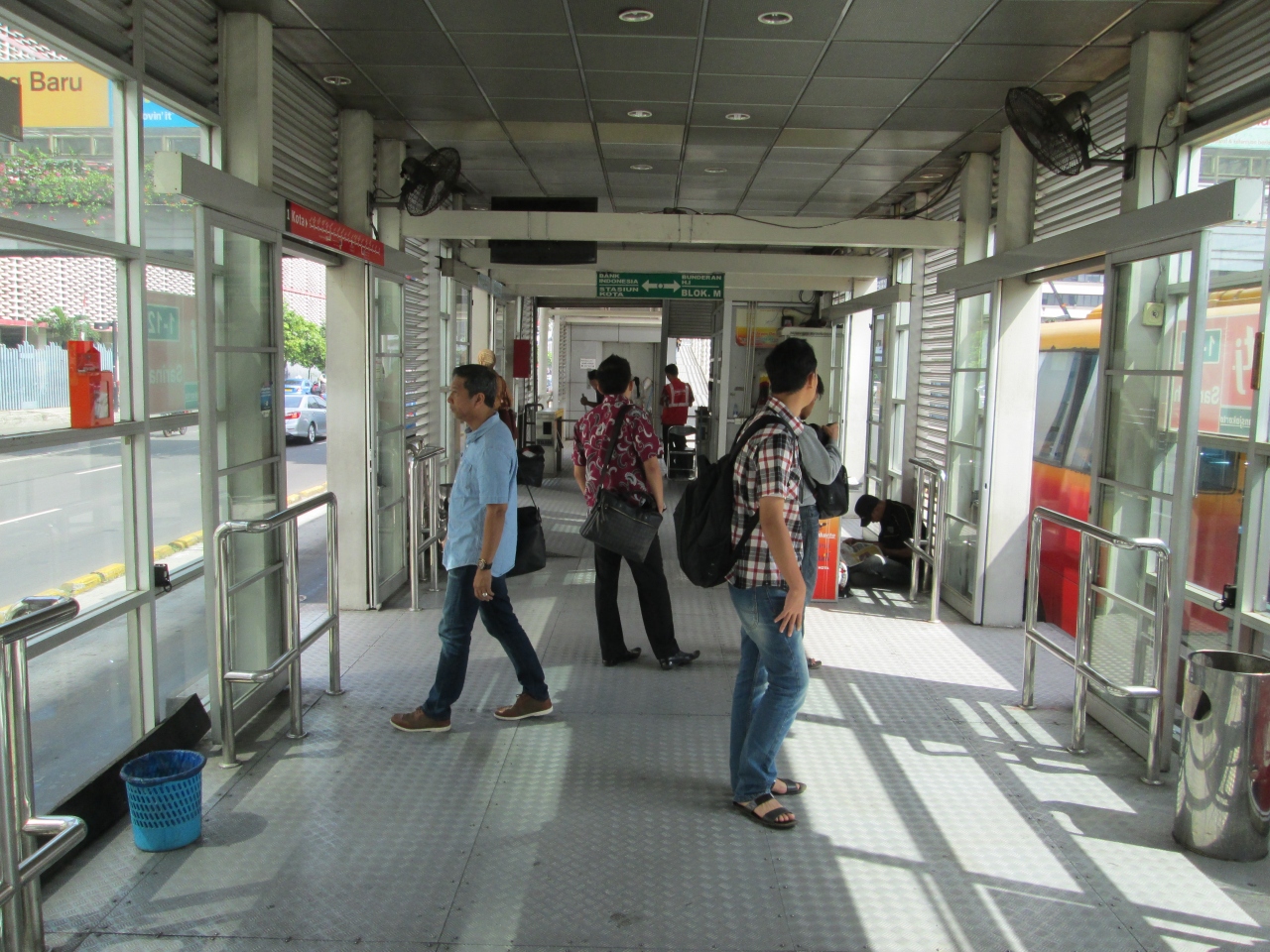 滞在中、サリナからモナス最寄まで、サリナからコタまでと数回利用しました。運賃は一律3千5百Rp.で、窓口の係員から購入する際、お金を出せば切符をもらえるので会話は必要ありません。早朝の時間帯は安くなるはずです。バスは専用道路を使うのであまり渋滞の影響を受けません。慣れれば便利です。ピーク時は1、2分に1本運行していますが、バスが混んでいたり、バス停に人が大勢待っている場合は、車掌が整理するので乗せてくれません。次かその次のバスを待つことになりますので、バス停に人が大勢待っている場合は、止めた方が良いです。バスの前側が女性で、後側は男性が乗るルールになっているようでした。バスに乗る時も女性優先でした。