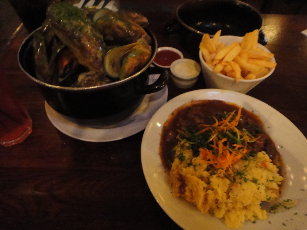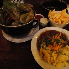 私たちはマッスル貝と店員さんおすすめの煮込み牛肉?のようなものを頼みました。