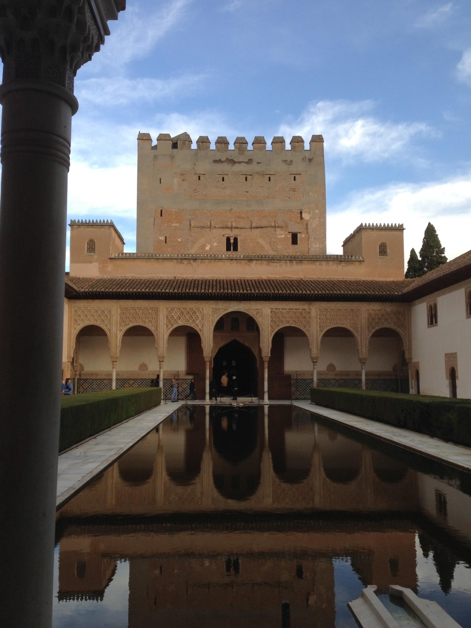 あまたに閉ざされし楽園とうたわれたアルハンブラ宮殿、宮殿内は部屋から次の部屋へ移動するのに直角に何度か曲がらないといけない仕組みになっています。外来者の方向感覚を失わせるためと、敵の侵入を防ぐためです。段差も結構あって、上ったり下ったりと忙しいです。壁や柱の上の部分の装飾がすばらしいので、見とれていると足元の段差で転びそうになったりします。車いすの方は、どうしても段差があるため一般見学ルートではなく車いす専用にあまり段差のないコースを見学することになります。宮殿内部の見学時はトイレがありませんので、必ず見学前に済ませることです。入り口の所に大きな無料のトイレがあります。