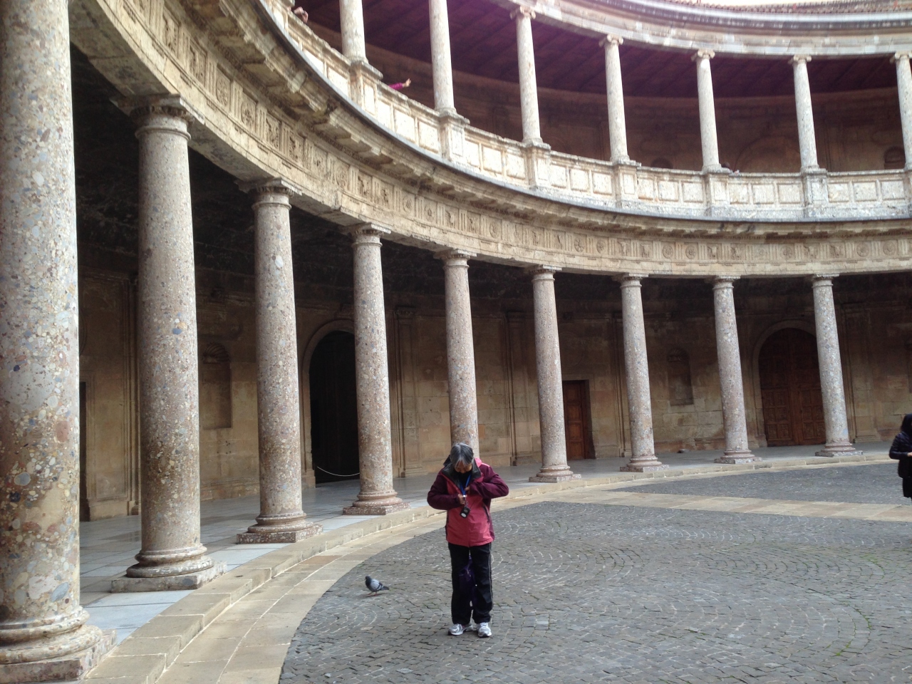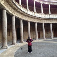 アルハンブラ宮殿のある城壁の中にある、新しい建物がカルロス5世宮殿です。スペインを旅していると、所々で耳にする王様の名前ですが、グラナダをイスラム教徒から奪回したカトリック両王、イサベルとフェルナンドの孫にあたる人です。この王様、コルドバではイスラム教徒の寺院のど真ん中に教会を立ててしまった人で、やはりアルハンブラ宮殿でも宮殿の中央にルネッサンス様式に基づいた大聖堂を建てようとしたのですが、残念なことに途中で亡くなってしまったので、未完成に終わりました。現在は2階までありますが、本当は3階まで作る予定だったとか。アルハンブラ宮殿の建築とは真逆で、外面を飾りたてていますので、やや違和感を感じるかも。