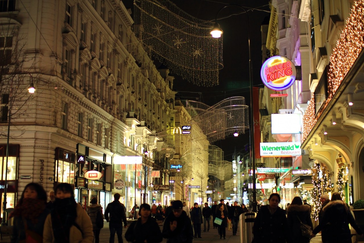 ウィーンの中心のシュテファン寺院からリンク通りのオペラ座方面まで行く、ウィーンの中央通りと言っても良い繁華街です。ちょうど冬で、クリスマスシーズンの始まりでしたので、街にはイルミネーションやツリーなどが飾られ、非常に華やいだ雰囲気でした。