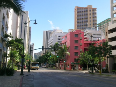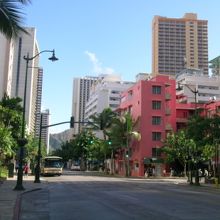 ワイキキビーチのフロントストリートから山側に入ったホノルルのバス通り。ABCストア、スタバ、マクド、レストラン、ヒルトンホテルがあり、ショッピングとグルメは便利なストリート。ホノルル空港へ$2で行くザ・バス(19番)のバス停もあります。