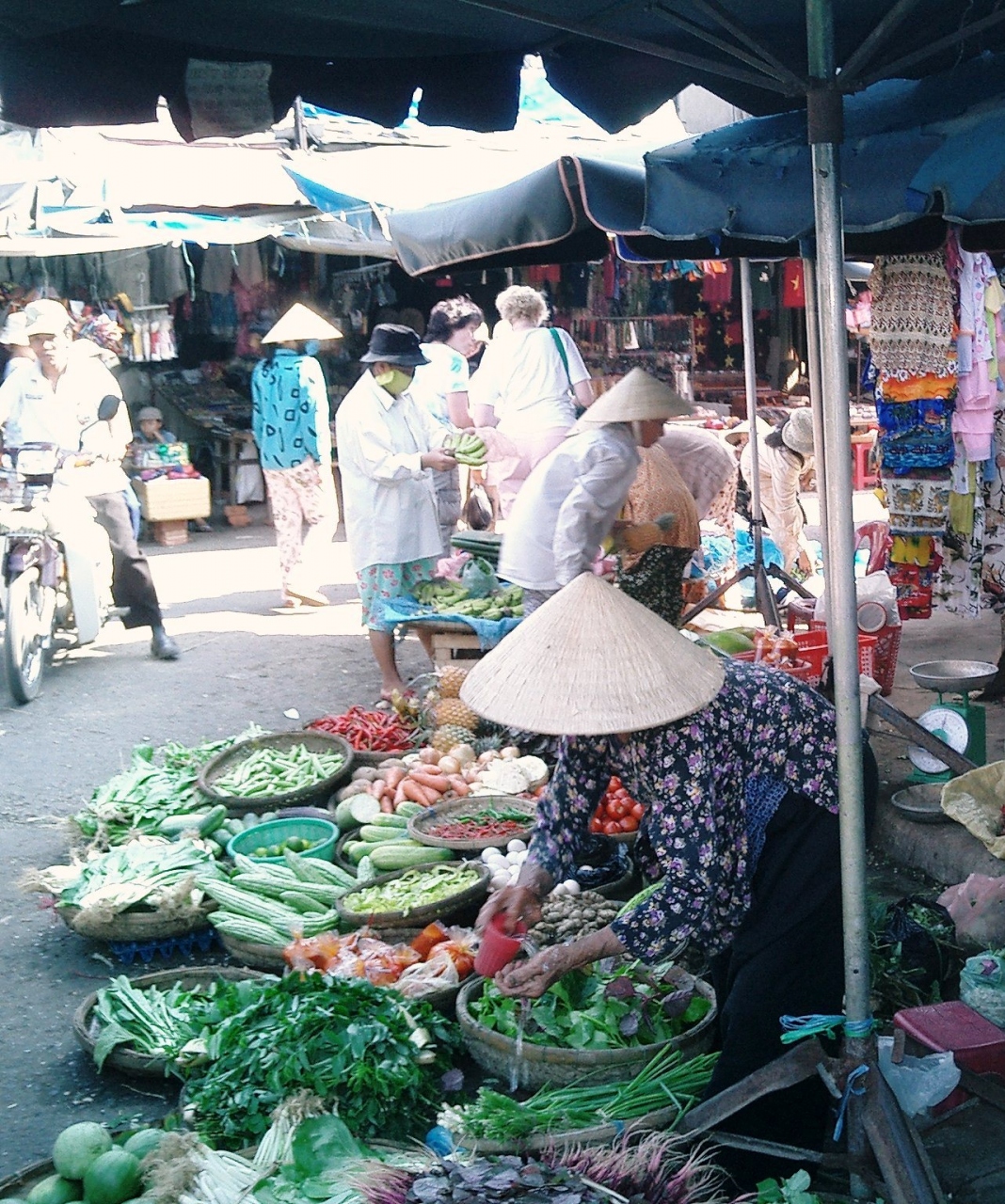いろんなものがうられていてホイアンの人の日常の生活が垣間見れます。日用雑貨からお土産物、野菜や肉類、果物などうられています。果物などは言葉はベトナム語がほとんですが、指さしでこの果物5個ほしいとか身振り手振りでなんとなく伝わります。