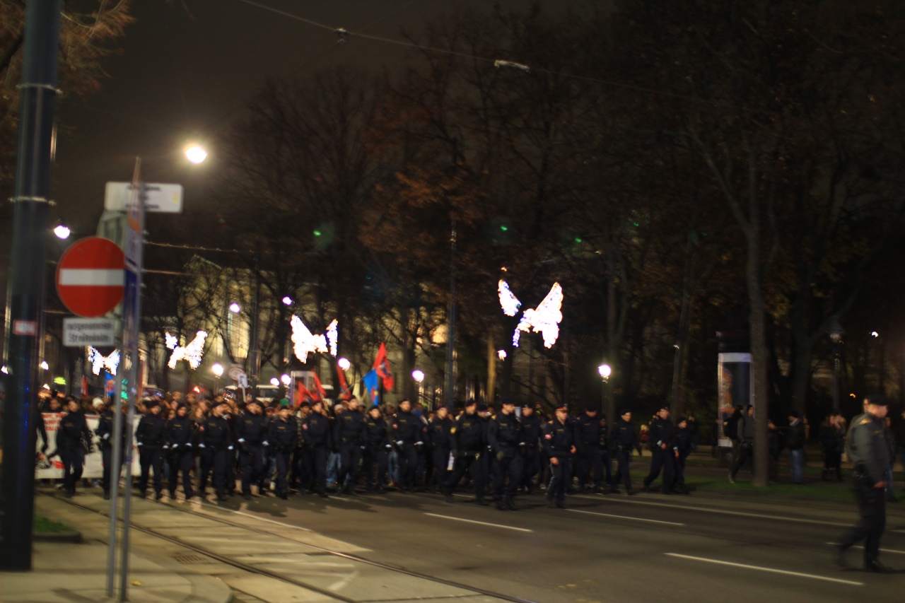 ここを通ったのは市庁舎前のクリスマスマーケットに行くためですが、帰りにリンク通りのトラムを待っても一向に来ません。おかしいと思ってリンク通りを歩いていくと、国会議事堂の前で、警官に先導されたデモが歩いていました。これが通りを占拠していたので、トラムが不通になっているようでした。