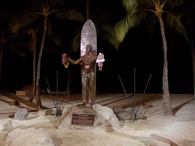 ワイキキビーチに寄り添うようにして建っているのが、このカハナモク像です。彼の生誕100周年を記念してこの地に建てられたそうですが、サーファー達が神様と崇める様な偉大な人物ですので、ハワイに来たらカメハメハ大王像と共に、必ず見ておきたい人物像の一つだと思います。尚、昼間は結構ひっきりなしに観光客が写真を撮っていますので、意外と夜がお勧めです。ライトアップされた彼の夜の姿は、尚更仰々しくて尊大に感じられました。