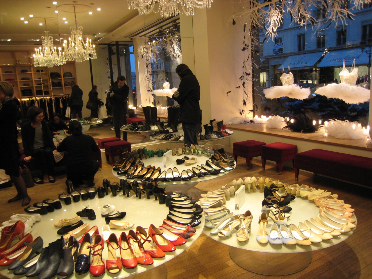 店内へ入ると、天井から吊るされた大きなシャンデリア、円形にきれいに並べられたシューズが目にとび込んできます。大きな鏡で店内は広々としているように見えます。