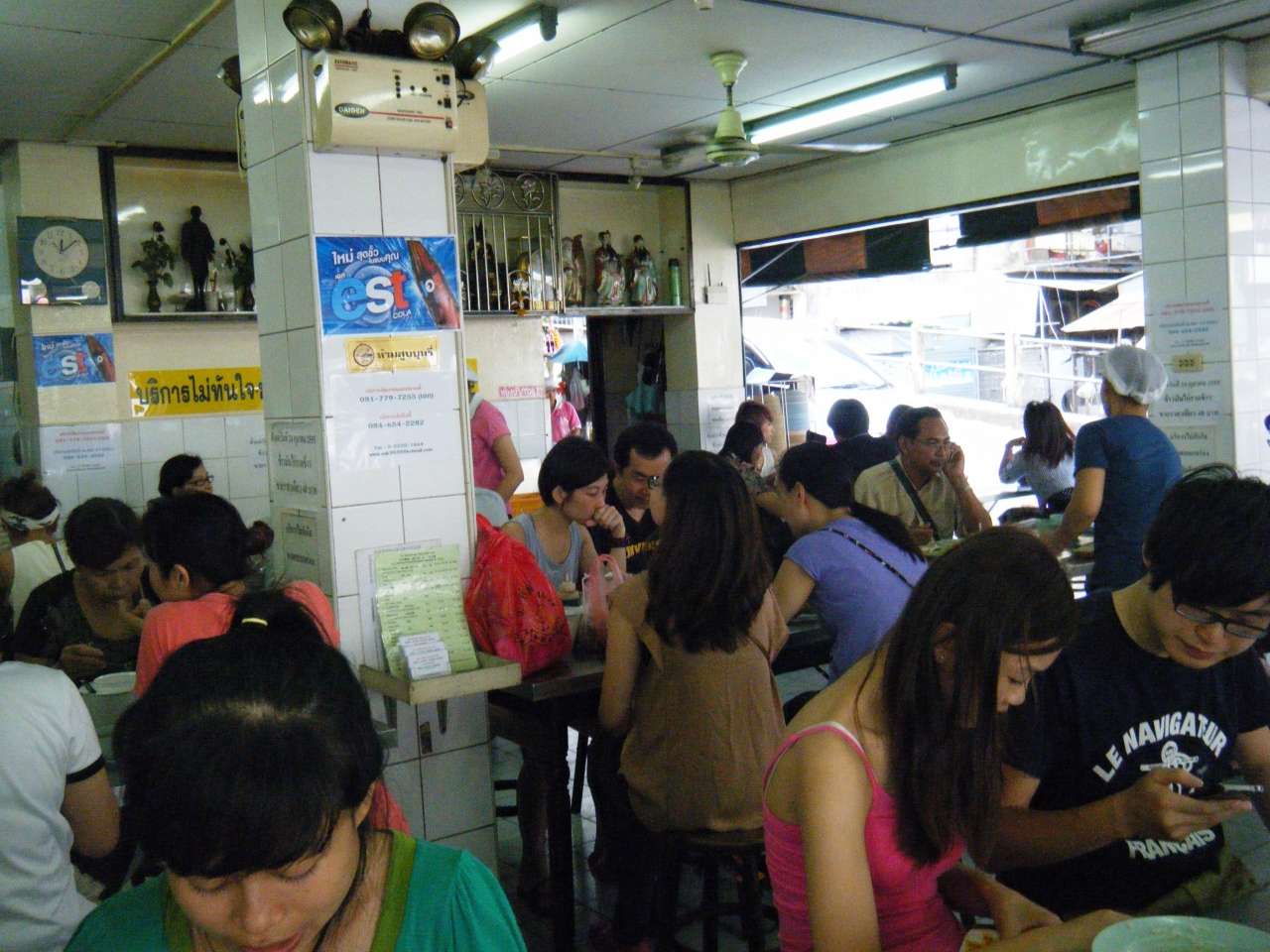 タイで有名な料理のひとつ「カオマンガイ」。それを美味しくいただけると評判の「ラーン・ガイトーン・プラトゥーナム」というお店、店名より「ピンクのカオマンガイ」と言った方が有名かも知れません。バンコクへは何度も訪れてはいますが、なかなか行けなかったここへようやく行くことが出来ました。BTSの駅などからはちょっと遠いですが、ぶらぶらがてら行ってみました。昼時行ったので、お店は超満員、地元の人で賑わっていました。地元の人があれだけ行くのですから、味は保証付きです。カオマンガイを注文してみました。一口食べ、一言「旨い!」評判通り美味しかったです。味は多少薄い印象を受けましたが、付いてきたタレを掛けて頂きました。蒸した鶏も柔らかく美味しいのですが、スープで炊き込まれたご飯が絶品でした。値段も40THBと100円程度です。ビールを置いていないのがちょっと残念かも・・・。
