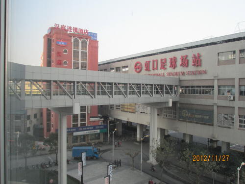 地下鉄虹口足球場駅は3号線が高架で8号線が地下にあります。名前の通り駅前に魯迅公園と虹口足球場があります。魯迅公園は戦争中は日本軍の射撃場であったり、近くに日本陸軍が有ったり、10万人程の日本人が住んでいた虹口でした。今まで3号線と8号線の乗り換えは一旦外に出て交差点を渡って地下3階の8号線ホームから地上5階の3号線ホームまで階段を登らなければなりませんでした。昨年暮れにオープンした龍の夢ショッピングセンターの中を通りエスカレーターで乗り換えが出来るようになりました。それでも5分程掛りますのでご注意ください。