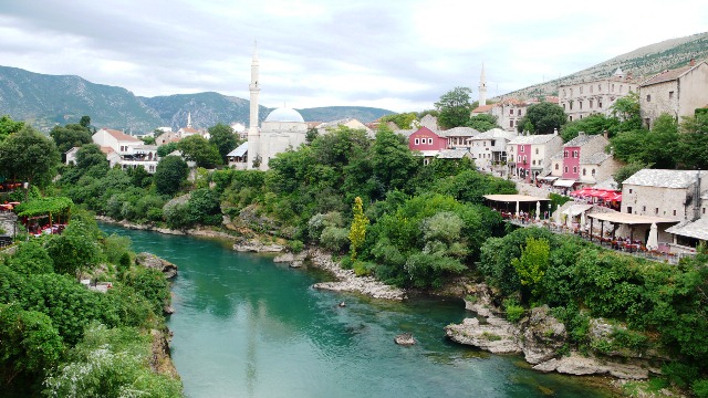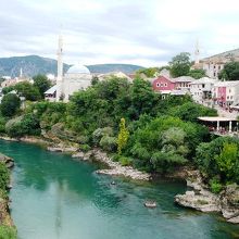 モスタルのスターリ・モスト橋から眺めたネレトヴァ川の眺めです。この川がモスタルの町をイスラム地区と正教徒地区に分けています。この橋から川に飛び込む、飛び込み大会が行われていることで有名です。橋にばかり注目が行きますが、このように橋からの眺めもなかなかです。