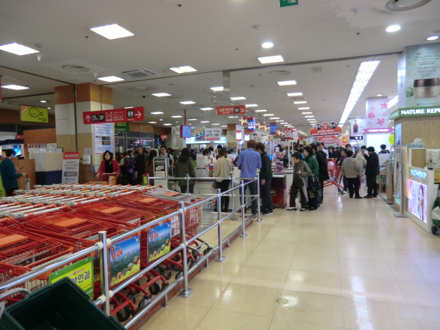 いつ行っても激込みのロッテマートですが、少量の商品を購入するときは入り口近くのレジがかご用になっていて比較的短時間で会計できます。大型のカート用は別になっているので使い分けて。商品によっては1+1(一つ買えば無料でもう一つ付いてくる)等がありますのでよく吟味して購入しましょう。