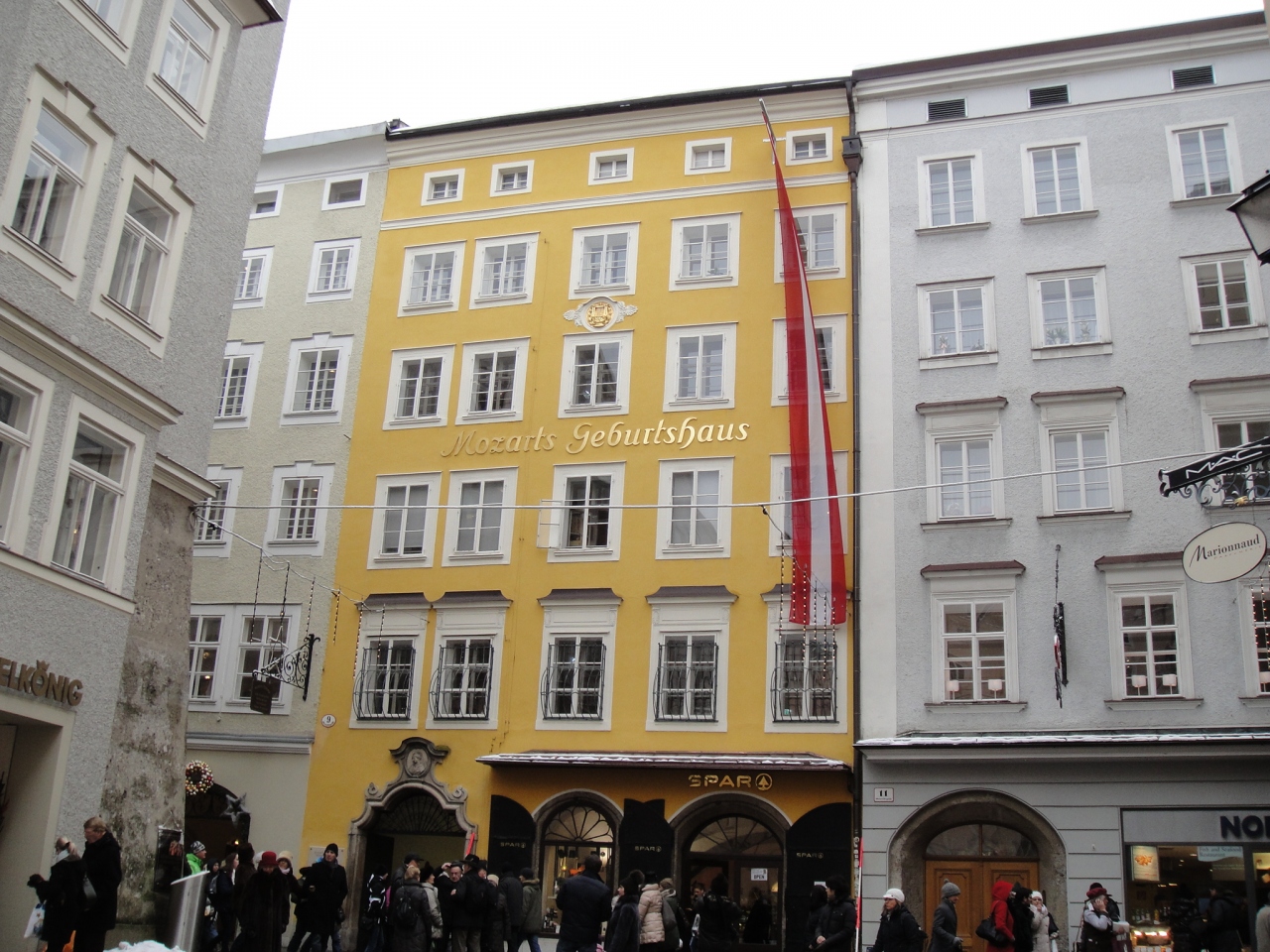 モーツァルトの生家は、旧市街のGetreidegasseでひときわ目立つ黄色い建物です。この建物はモーツァルト一家が1747~1773年まで住んでいた家で、モーツァルトは1756年1月27日にここの4階で生まれたといわれています。階段を上がって2階にチケット売場があります。ザルツブルクカードの利用ができます。