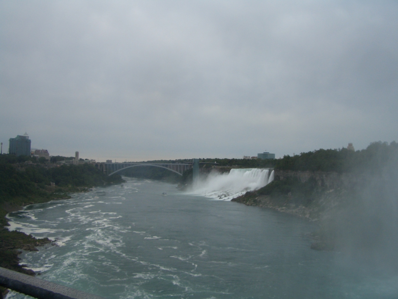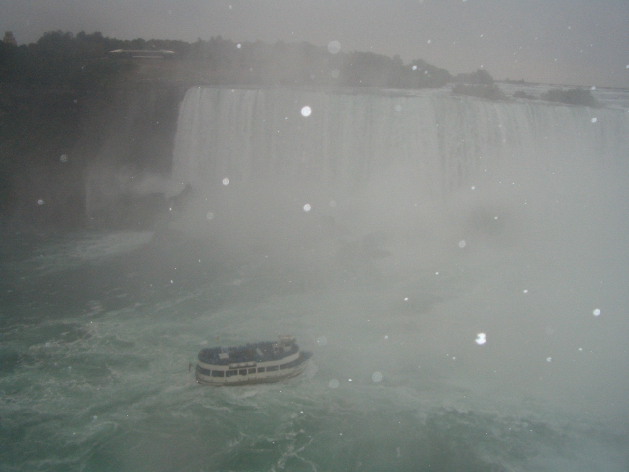 ニューヨークからオプショナルツアーで行きました。霧の乙女号に乗り、滝壷の近くまで行きました。水色のポンチョを借りて滝に近づいていくときはワクワクしました。滝壷近くに行くと、目も開けていられず、嵐の中、船に乗っているような感覚でした。滝を上から見ても水しぶきがとんできて、迫力がありました。