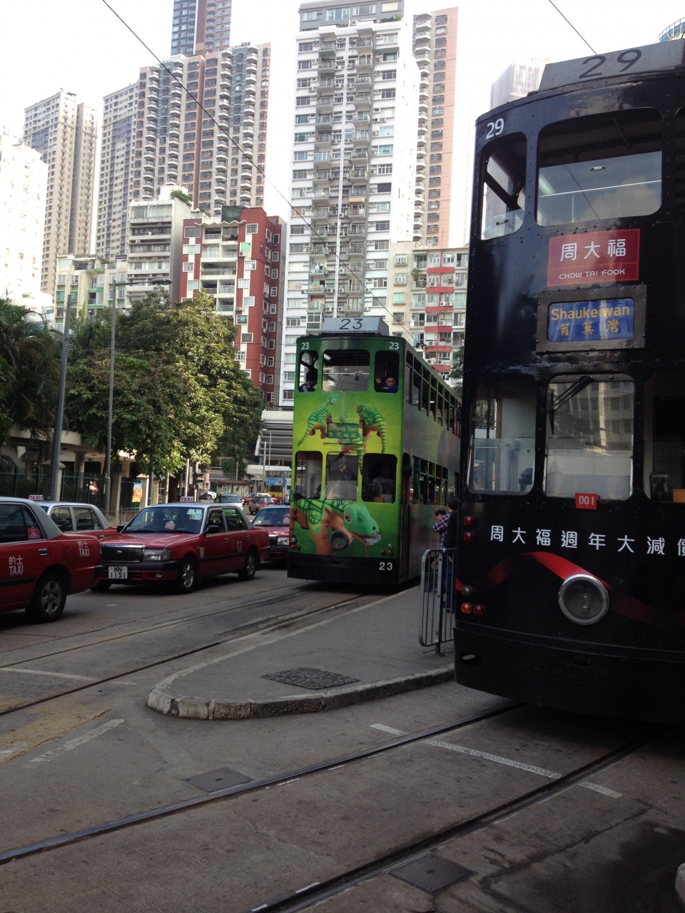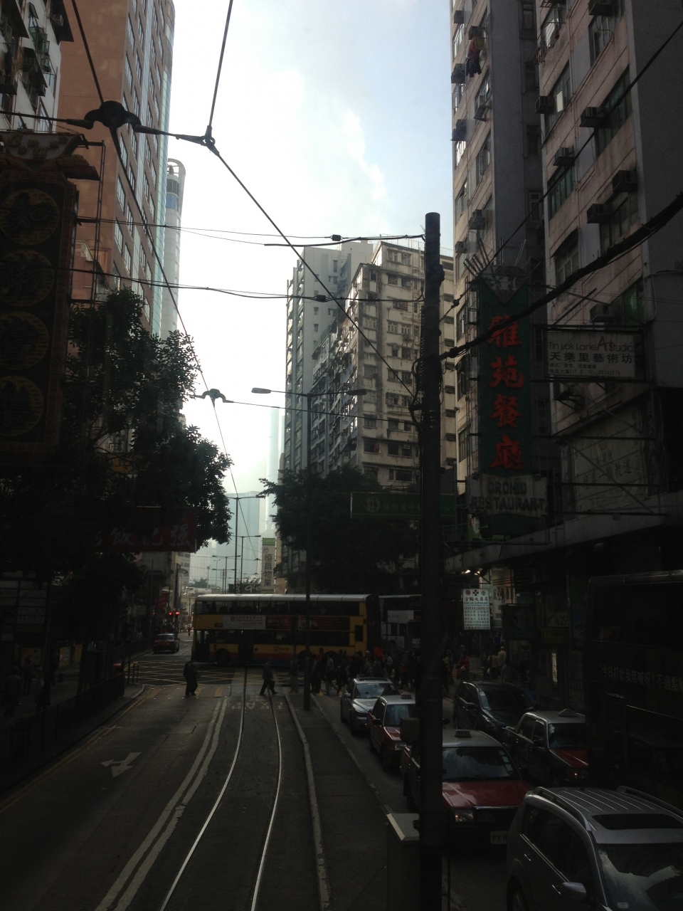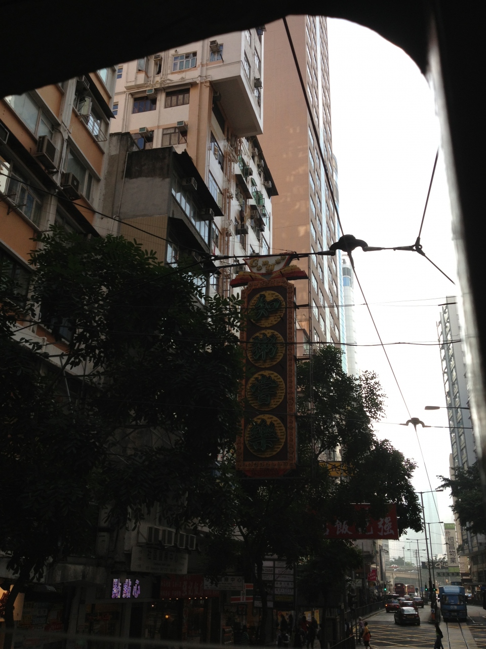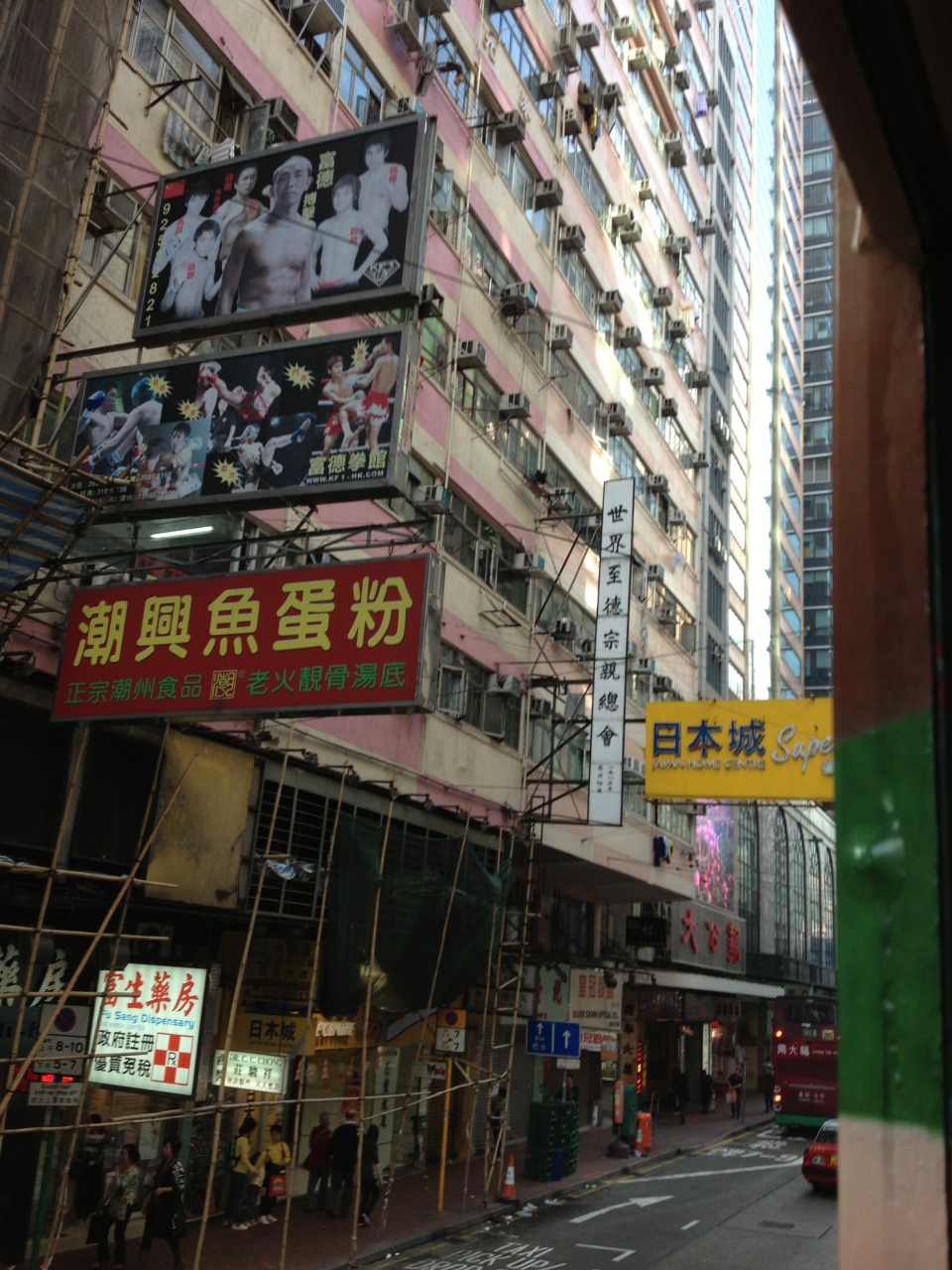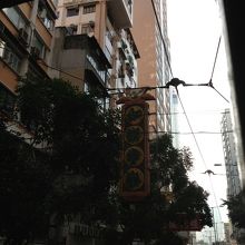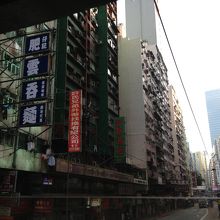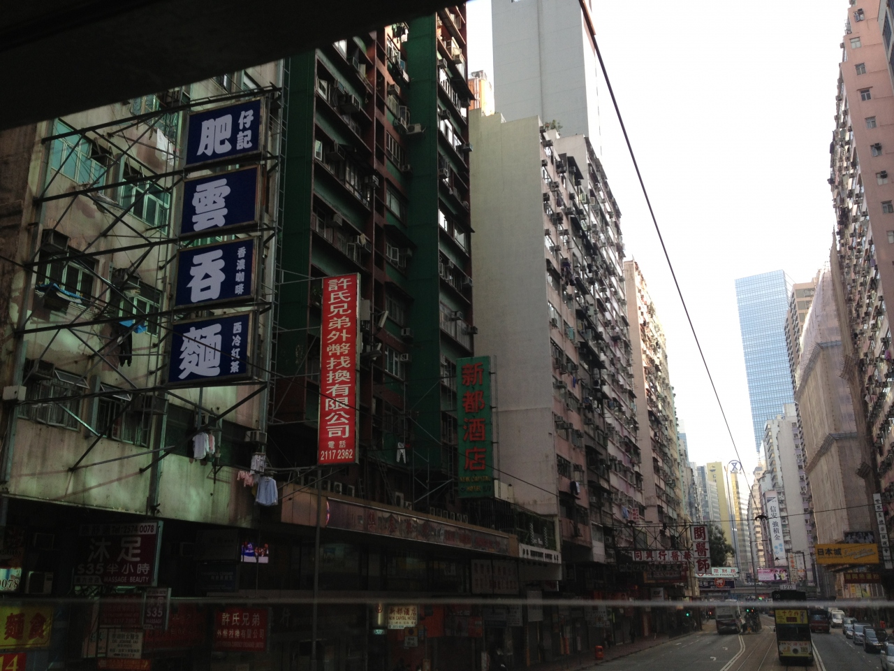 香港の名物である道路に大きくはみ出たネオンサイン型看板が目の前を横切ります。
