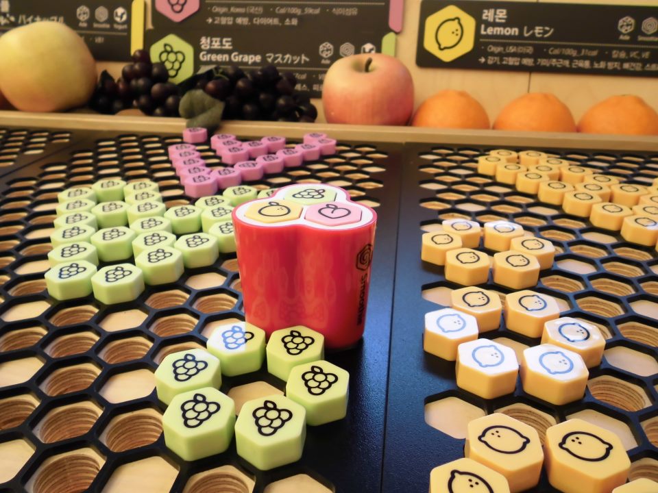 好きな果物や野菜の中から3種類のピースを選んでケースにはめこみます。