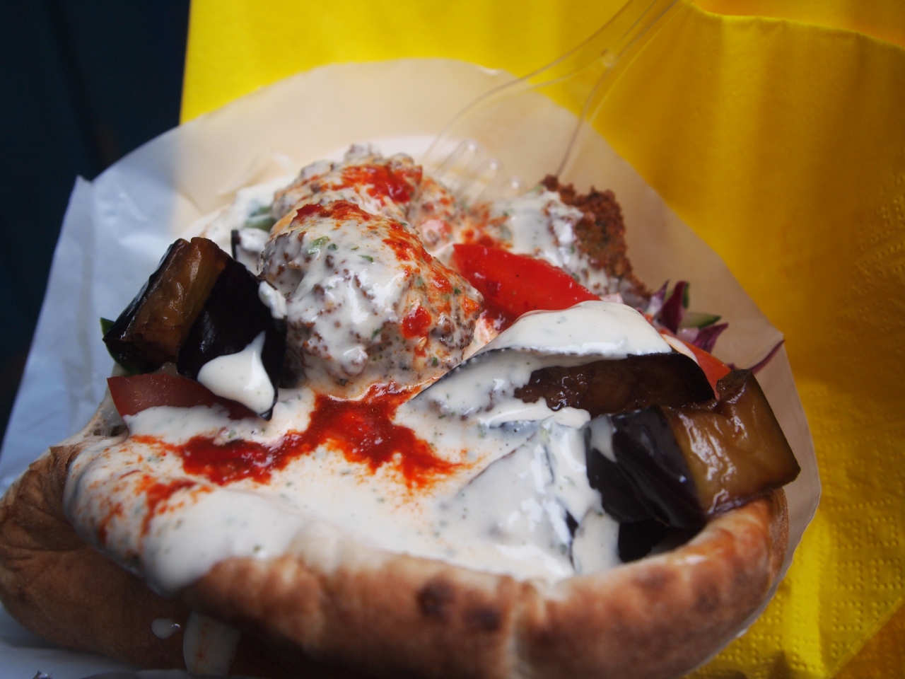 マレ地区にある有名店です。寒い季節にもかかわらず店の前には10人ぐらいの列がありました。並んでいる時に注文を聞いてくれます。すごくテキパキしているので5分もたたずに食べることができました。安くてボリューム満点。食べきれないほどです。揚げ茄子が特に美味しかったです。また食べたいです。