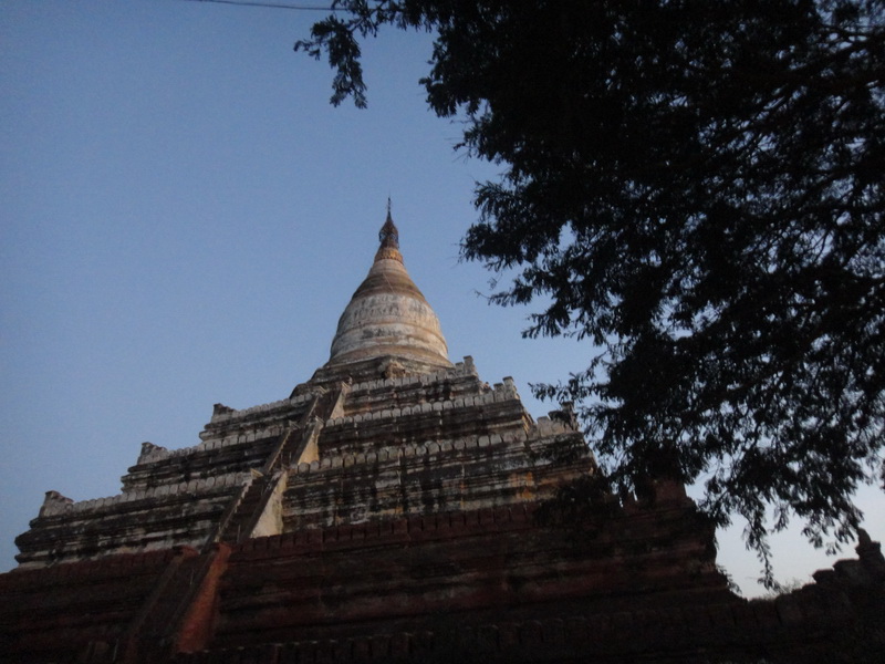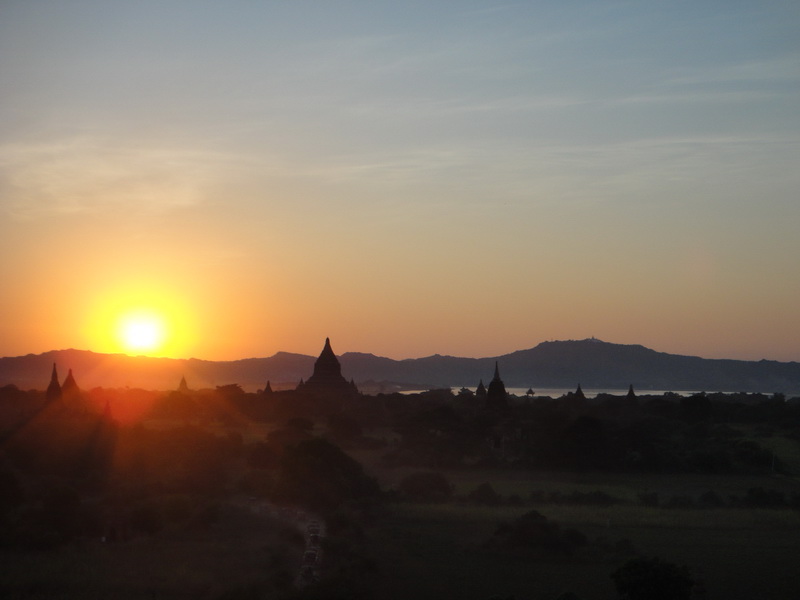 夕日を見るために、日が沈む30分ほど前に場所を確保するために到着しました。すでに寺院の上の部分はかなりの数の観光客がいましたが、無事場所を確保することができ一安心。そのまま日暮れまで待ちました。さすがに、イラワディ川まで見わたすことのできる風景に夕日が沈んでゆく景色は圧巻でした。観光客の多さ、上に登るまでの急な階段(降りる方が気を使います)、などを考慮しても、パガン観光では外せないスポットだと思います。