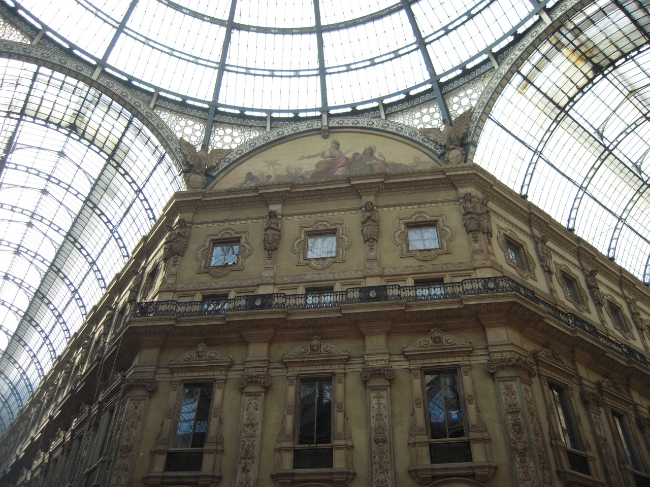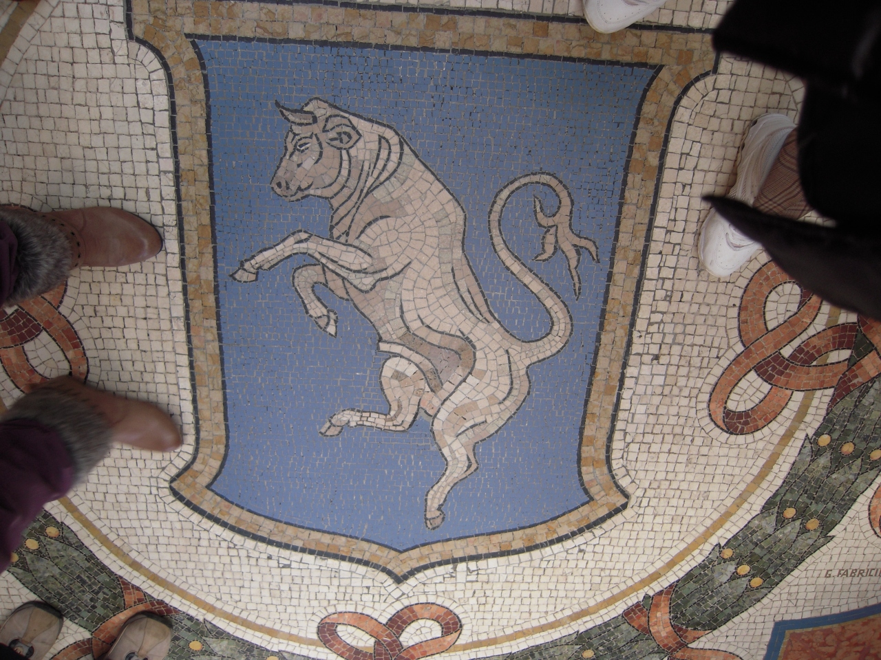 ツアーのバスでスフォルツェスコ城にちょっとだけよって、ビットリオエマヌエーレ2世アーケードに来た。アーケードの交差部分に雄牛のモザイクがある。