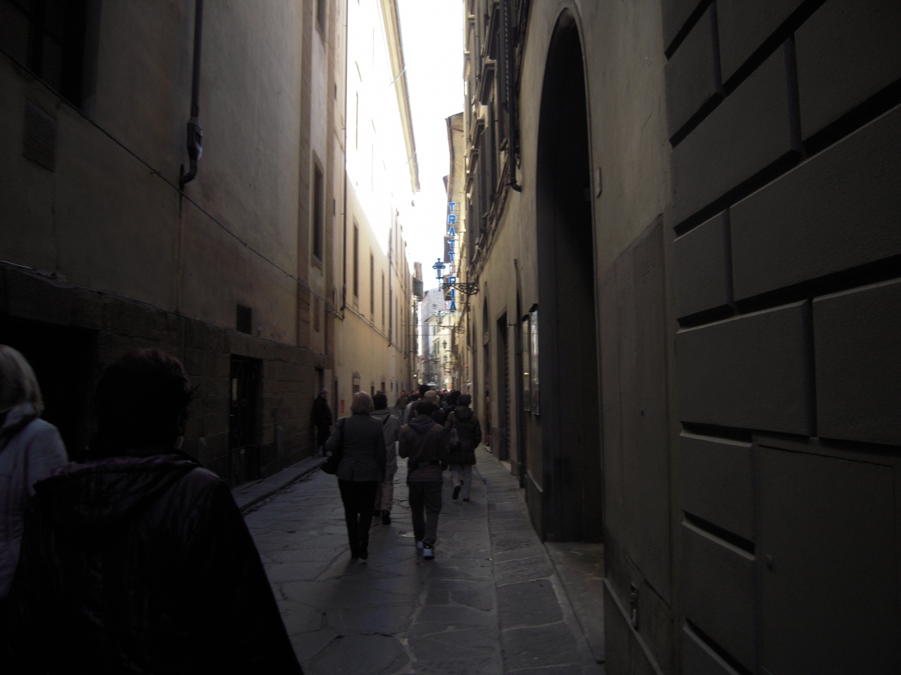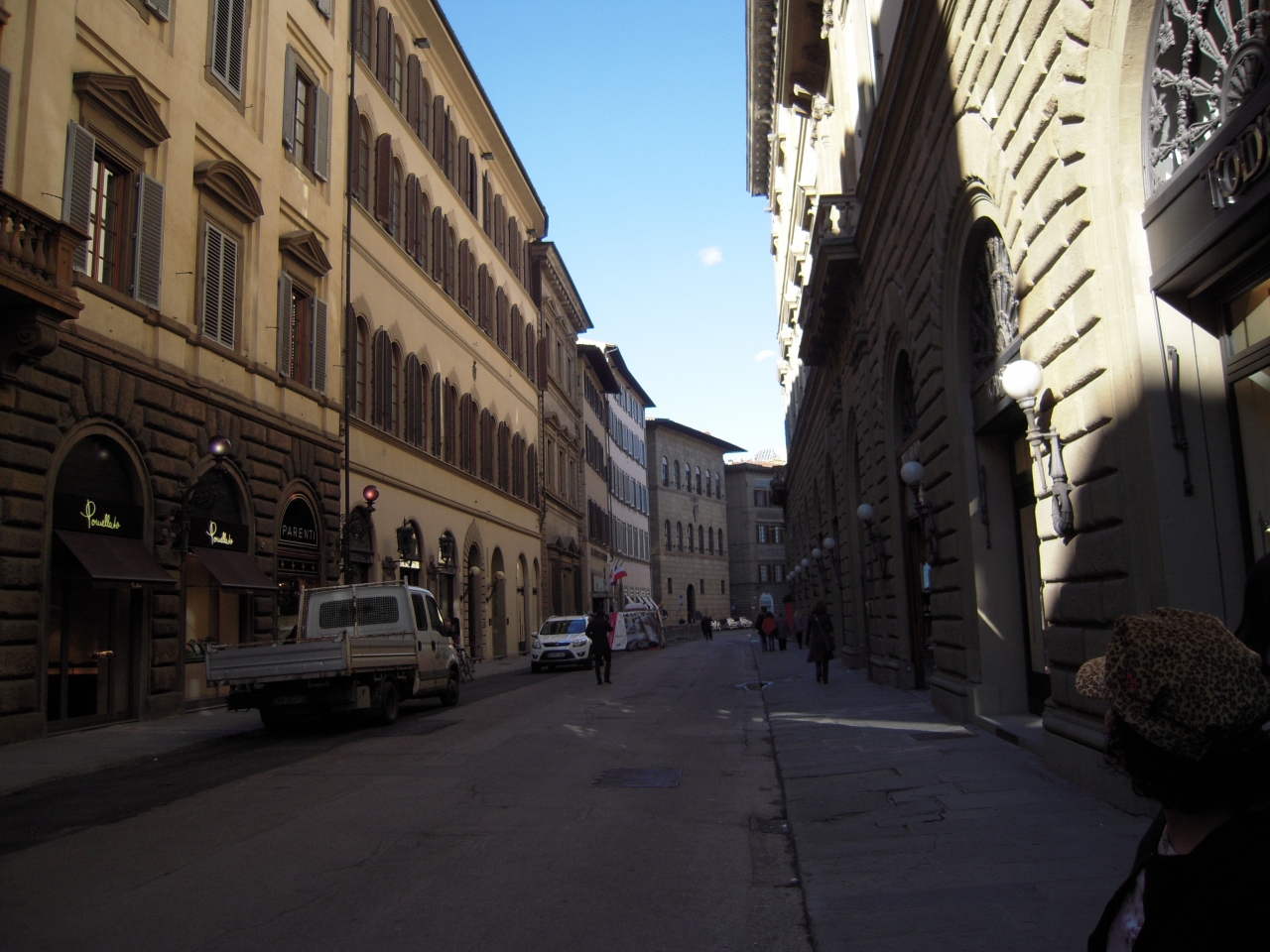 シニョーリ広場近くの狭い路地は結構魅力的、トルナヴォーニ通りの貴族の館は淋しい通り