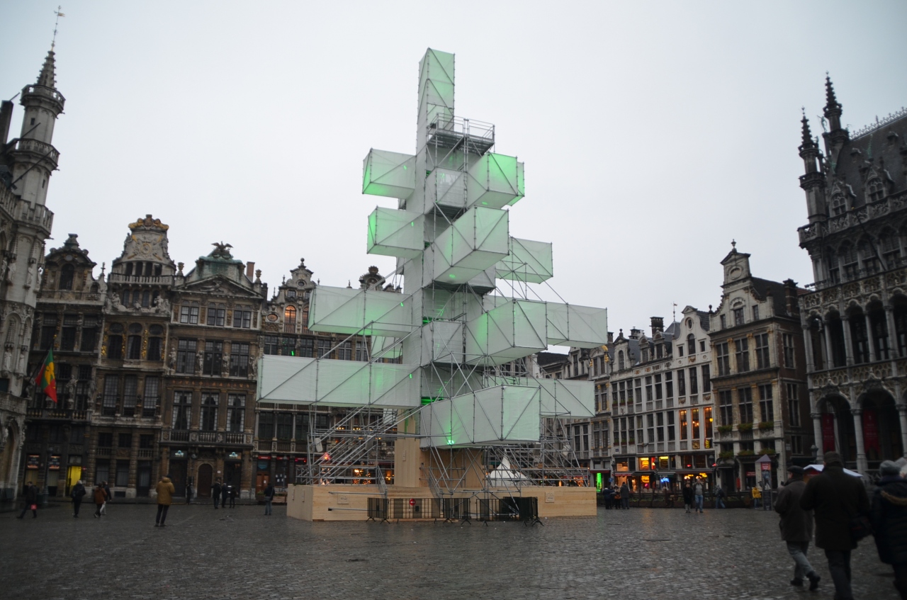 クリスマスのグランプラス、今年は提灯のような電球が入った箱を積み上げたツリーが登場
