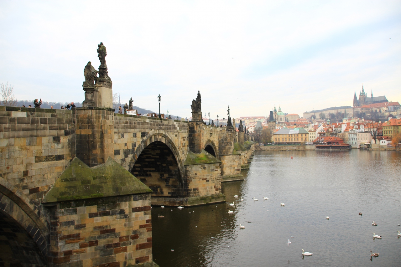 プラハでの観光ポイントと言ったら、プラハ城、旧市街広場、そしてこのカレル橋が最も有名でしょう。モルダウ川にかかる橋は幾つかありますが、ここからはプラハ城も、旧市街方面も双方が見渡せ、橋の周囲には聖人の像が並び、昼の景色も、夜景もすべてが絵になる光景となっています。