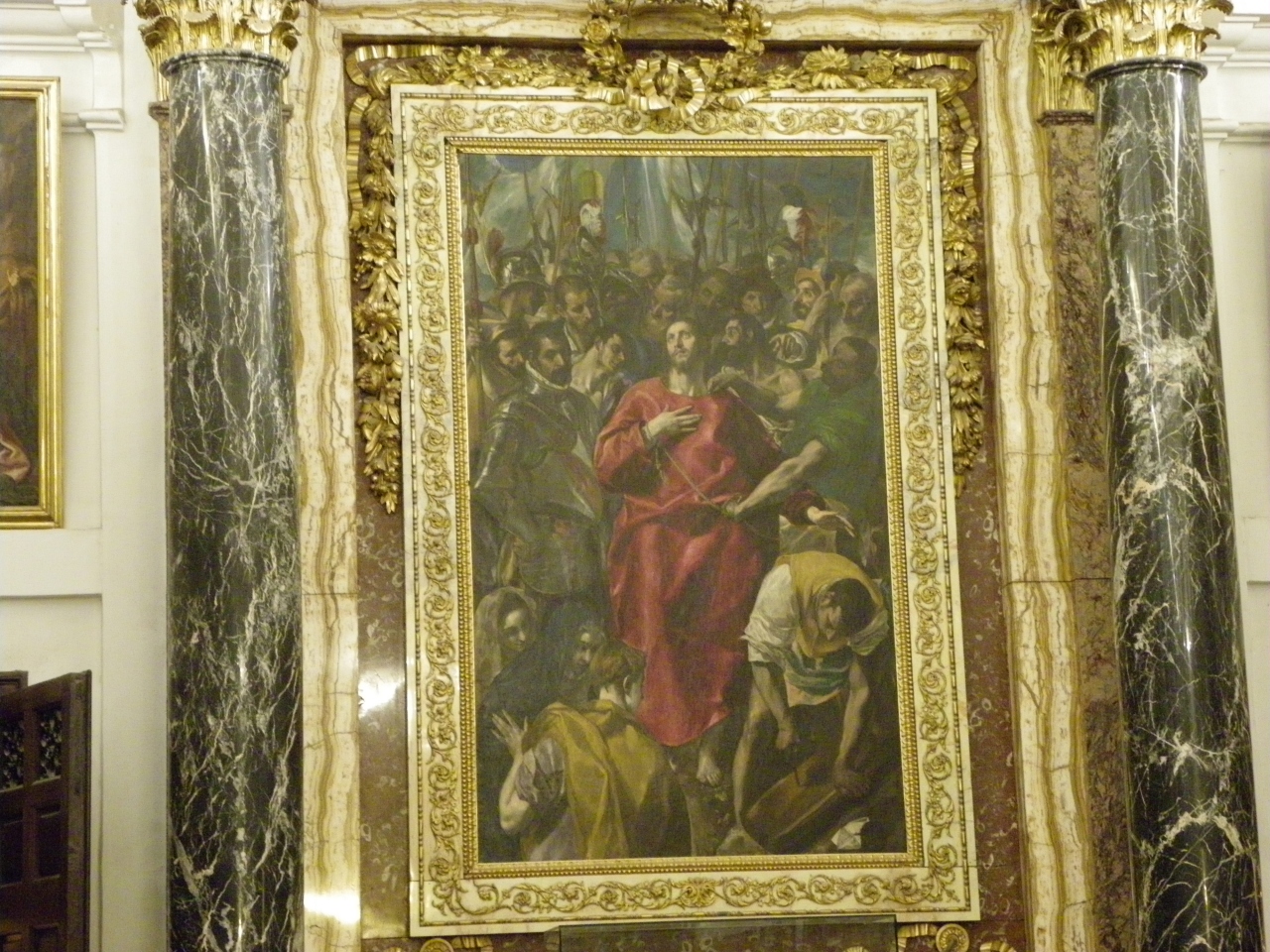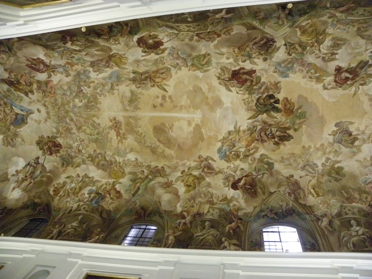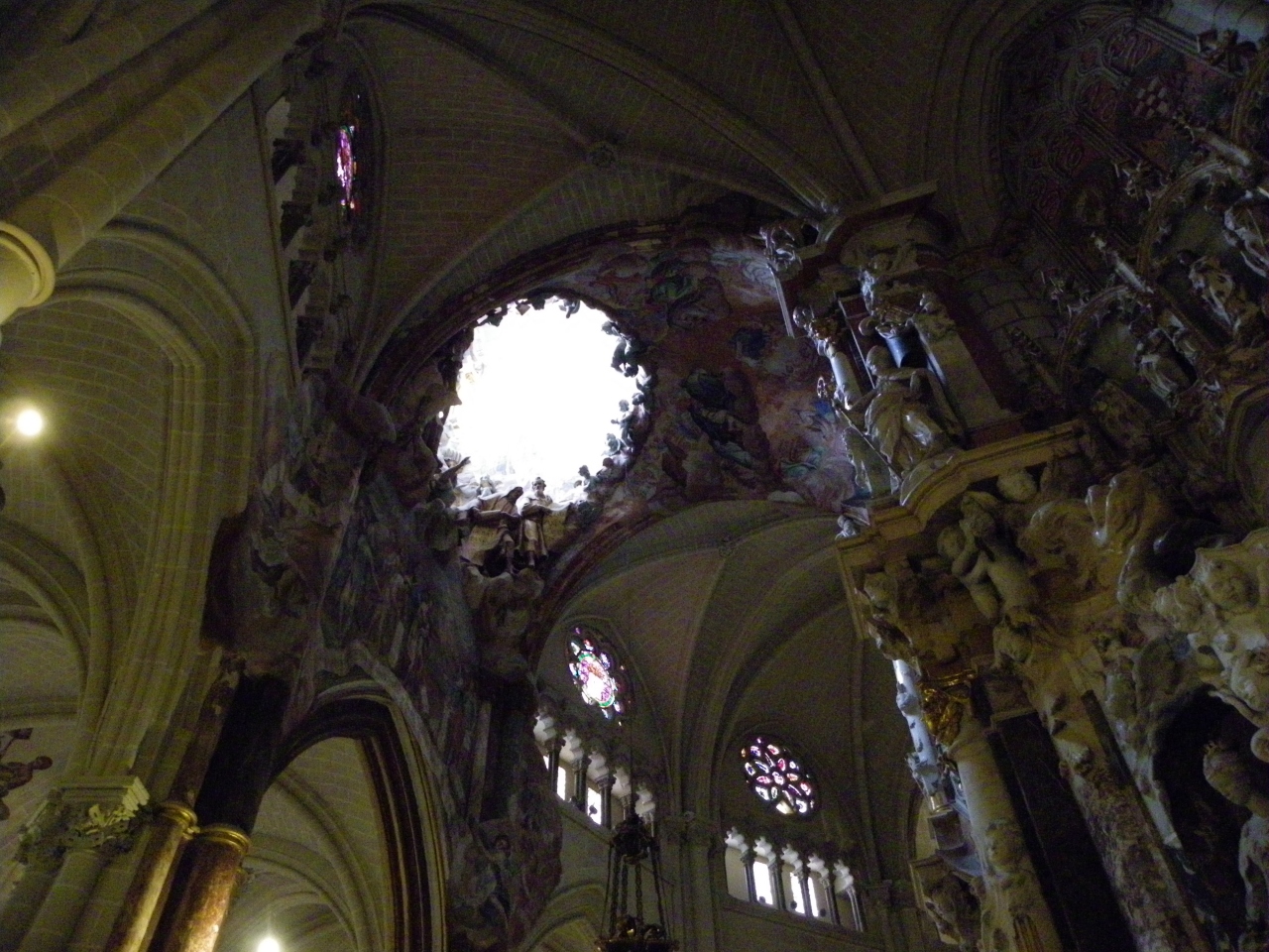 暗い地上では正にイエスが十字架にかけられようとしています。それを心配そうに見つめる天上の天使たち。そこには一筋の光明が見えます。絵だけでは不十分と思ったのでしょうか、天井の明り取りの窓は、天上から心配そうに見下ろす影が見え、光明が教会の中を照らし出します。
