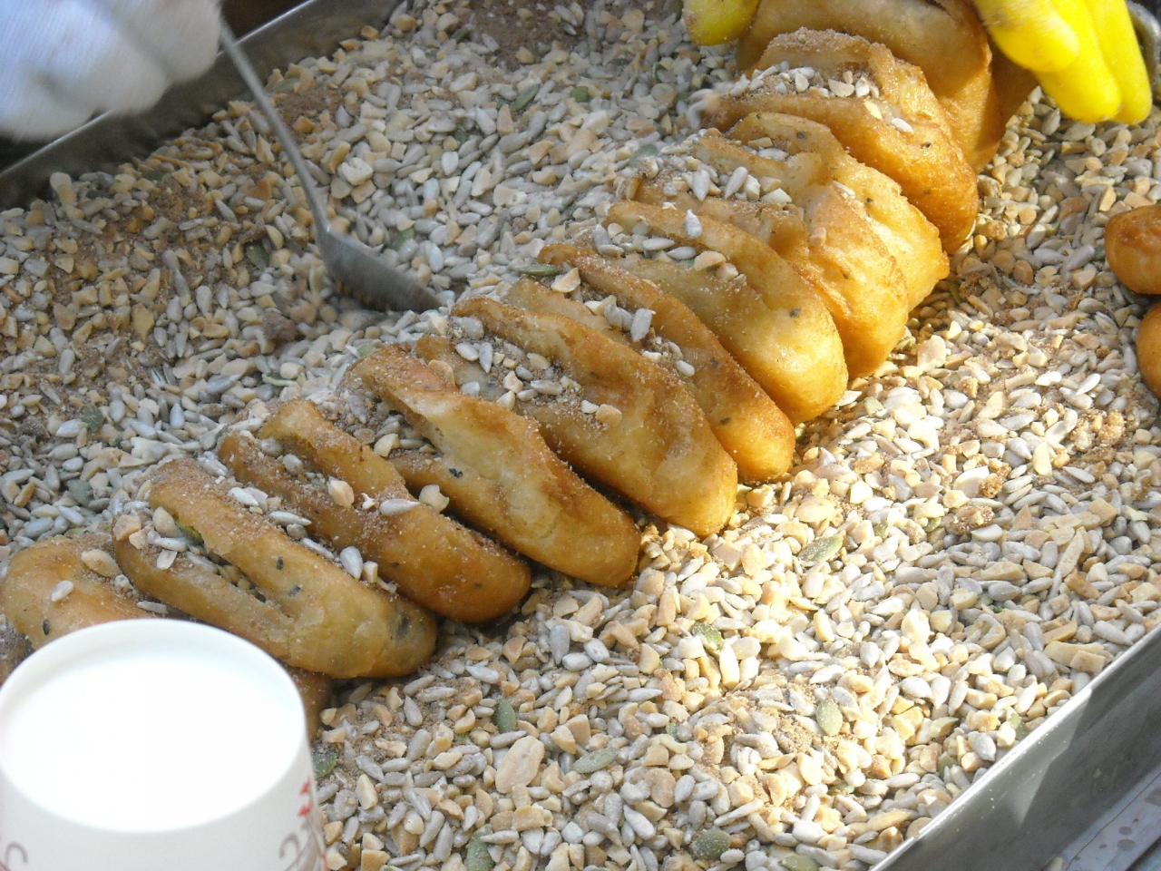 屋台がでていて人気のお店には列ができています。ホットクはオススメのようです。私はホットクと豚の串を頂きました。ホットクはまた食べたい思わせてくて、900wonで財布にもやさしい。豚串のタレは辛いのから辛くないのも選べます。辛いのは本当に辛いので要注意でうs。