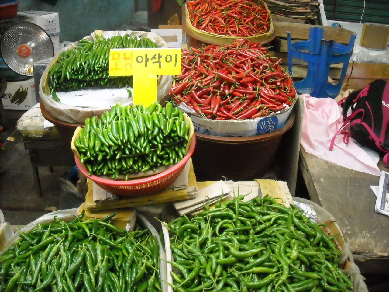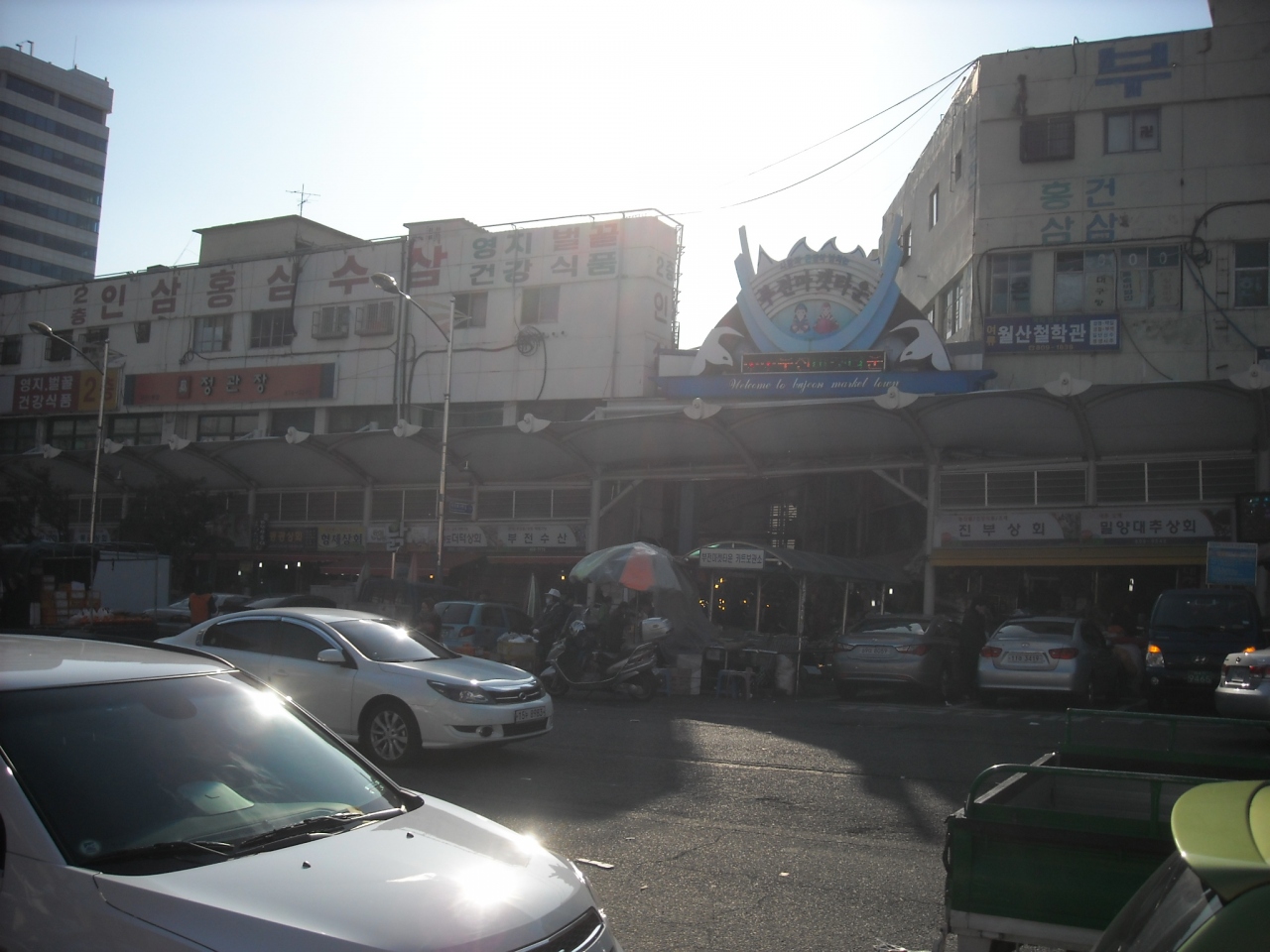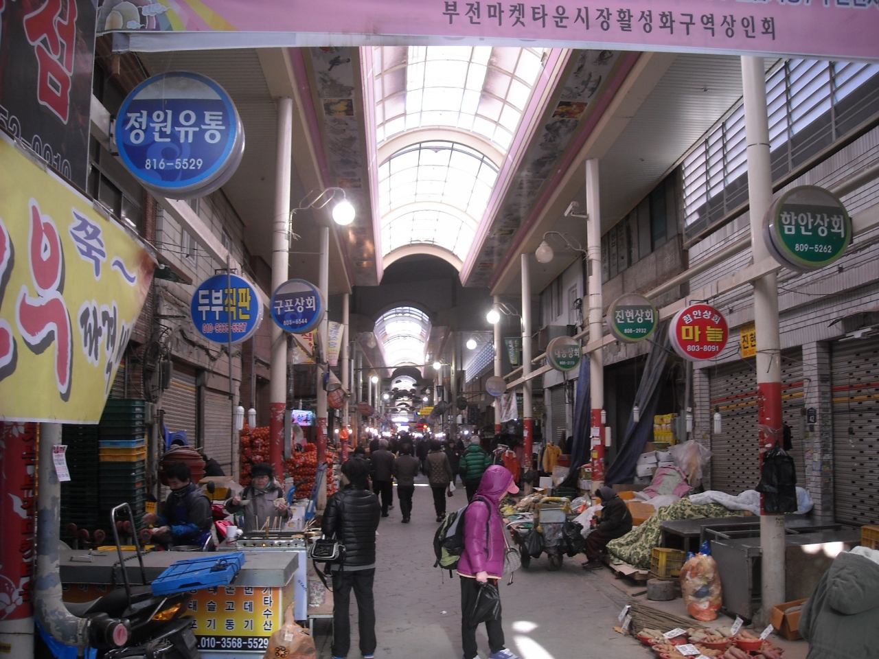 西面の釜田駅の間にある釜田市場。入ってみると庶民向けの市場です。